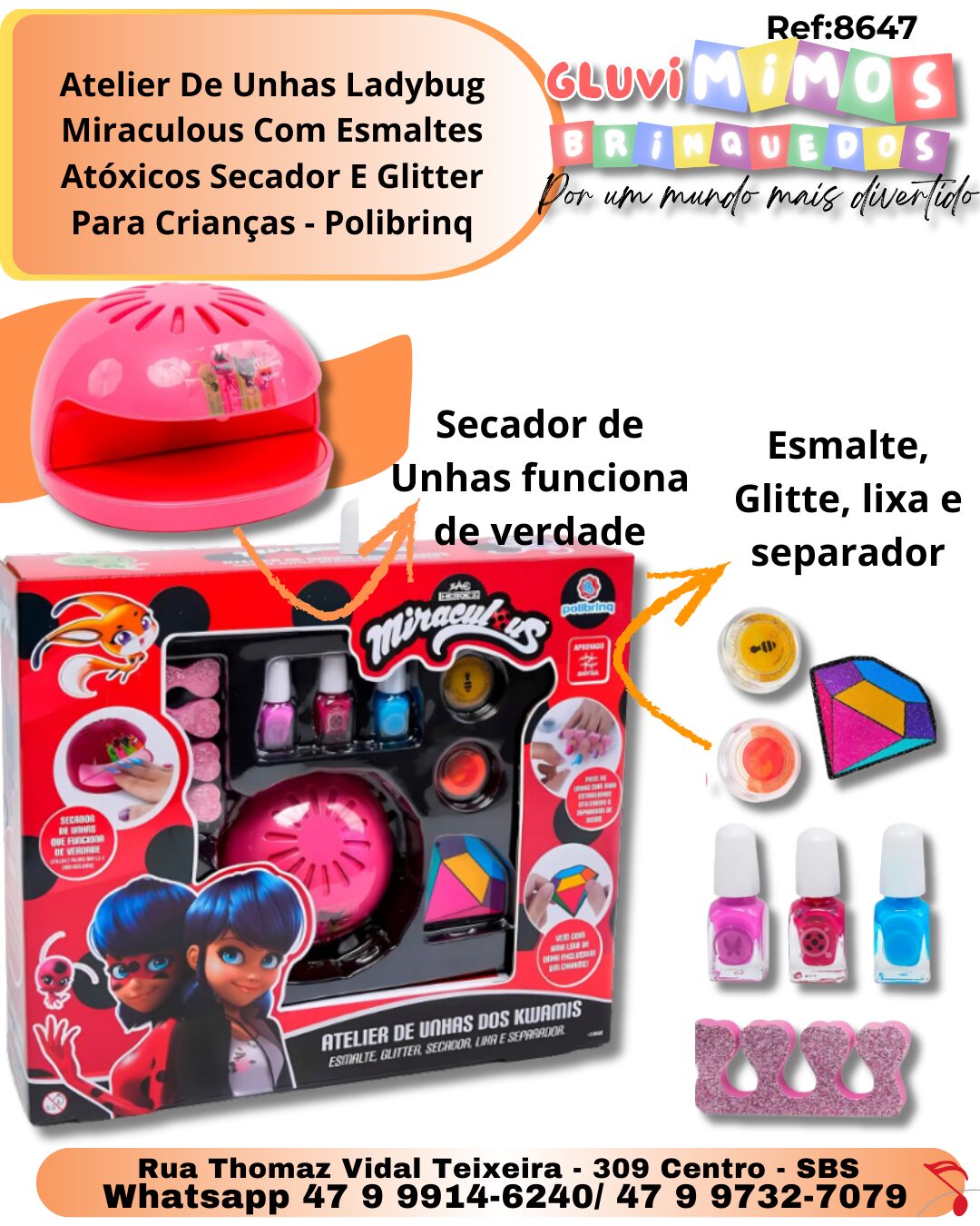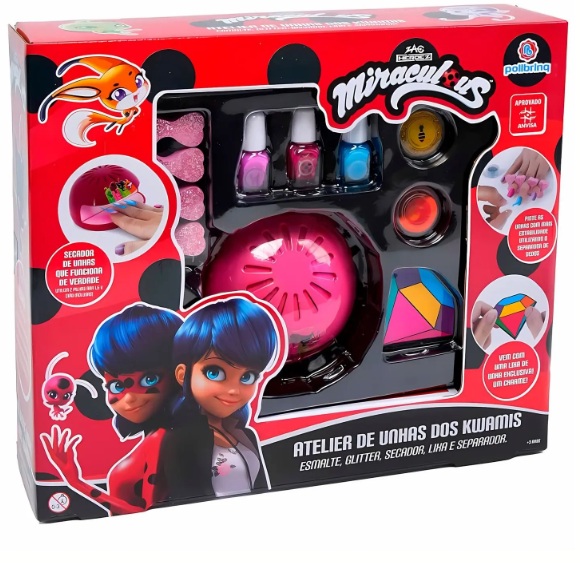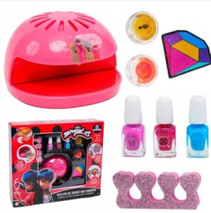 O Kit de Manicure Miraculous Ladybug da Polibrinq traz tudo o que as pequenas fãs precisam para unhas estilosas: esmaltes, separador de dedos, potinhos de glitter cintilante, lixa suave e secador de unhas portátil. Cada item foi pensado para oferecer diversão e praticidade ao criar looks super estilosos.