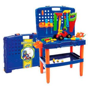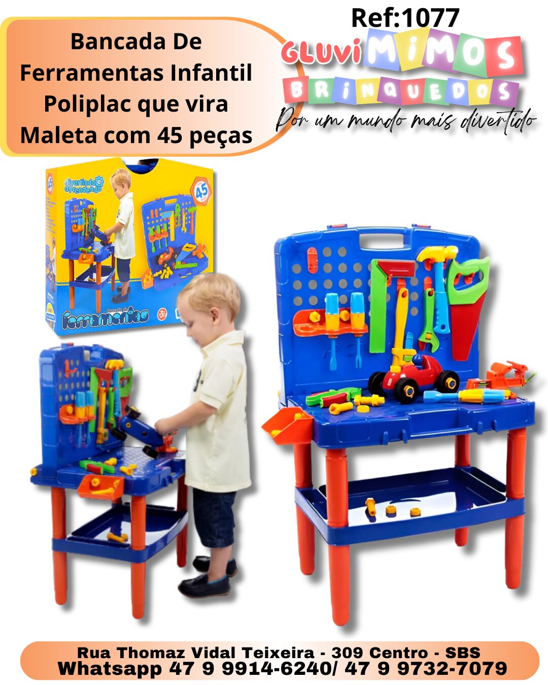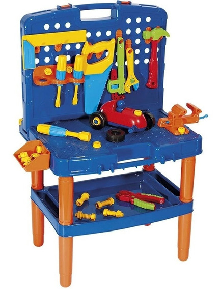 Conteúdo da embalagem: 1 bancada, 1 bandeja intermediaria, 8 pés (conjuntos), 1 morsa, 1 suporte, 8 ganchos, 1 bandeja pequena, 1 carrinho para montar, 9 ferramentas, 14 parafusos