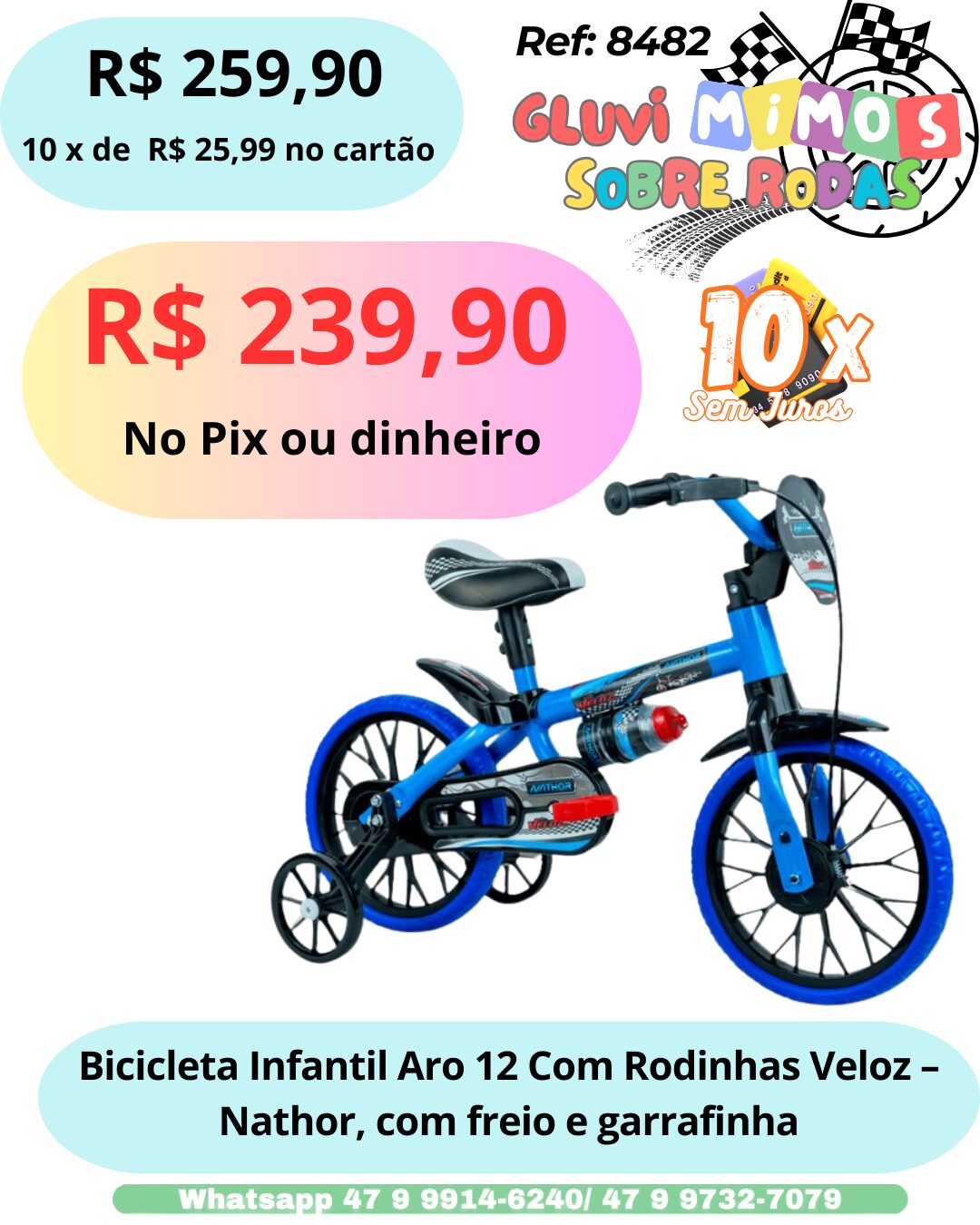 Bicicleta Infantil Aro 12 Com Rodinhas Veloz – Nathor, com freio e garrafinha