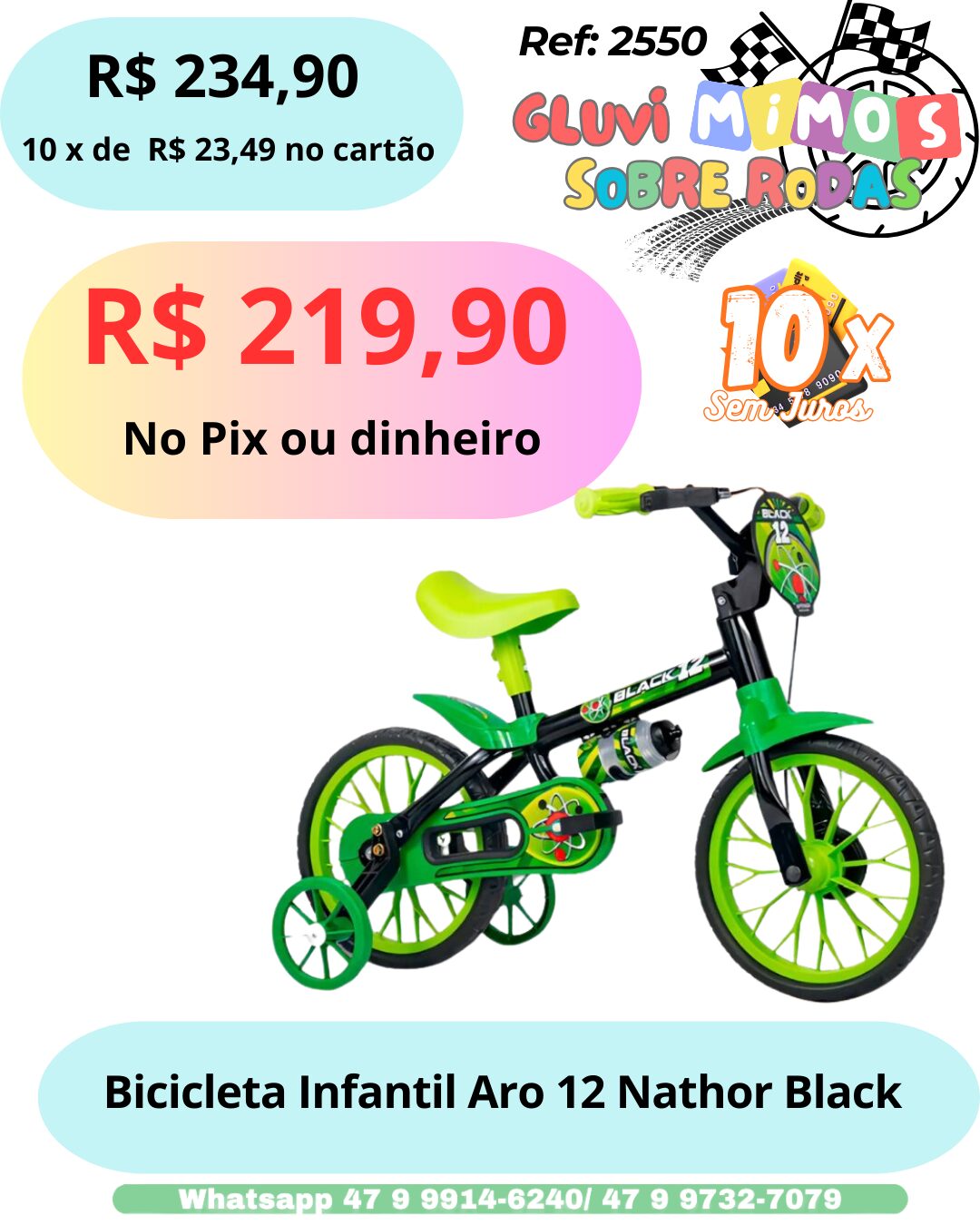 A Bicicleta Aro 12 da Nathor proporciona um pedalar mais seguro, confortável e com mais equilíbrio, pensando sempre no bem estar e segurança dos pequenos. Possui limitador de giro do guidão, importante característica que evita com que guidão dê uma volta completa e danifique o freio, além de preservar a integridade física da criança. Possui também freio a tambor, garrafinha, pneu em EVA, quadro, garfo e guidão em aço carbono, guidão com sleeve, placa frontal e cores alegres. Tudo o que a criança precisa para se divertir com segurança e conforto.