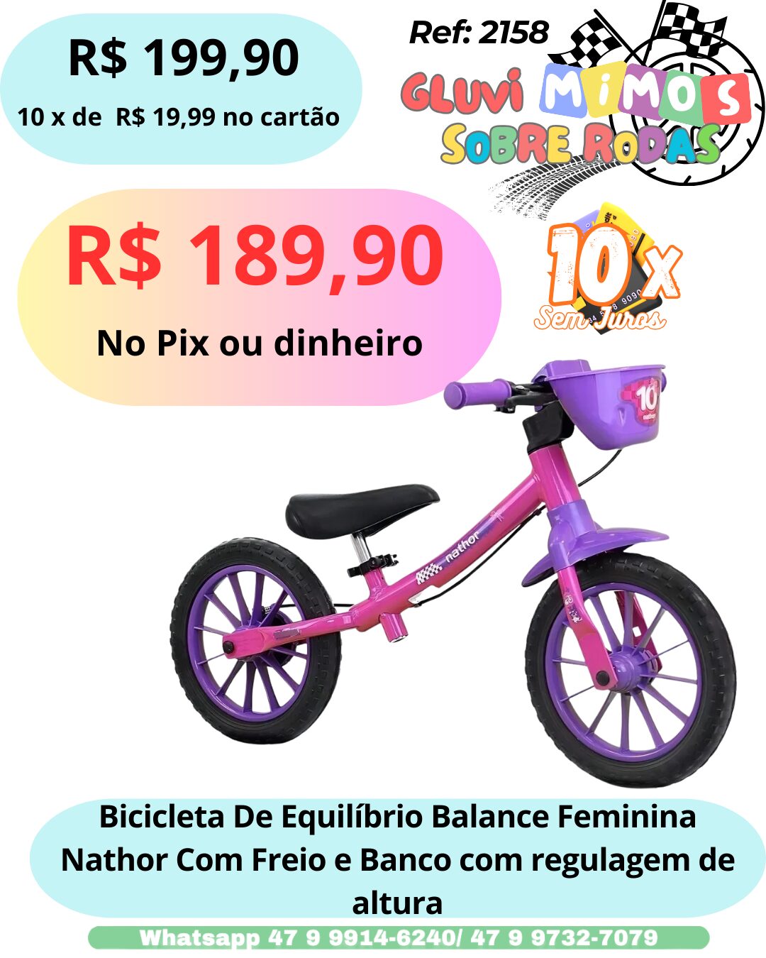 Bicicleta De Equilíbrio Balance Feminina Nathor Com Freio e Banco com regulagem de altura