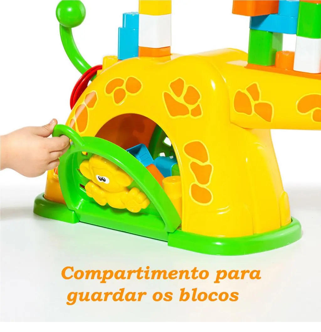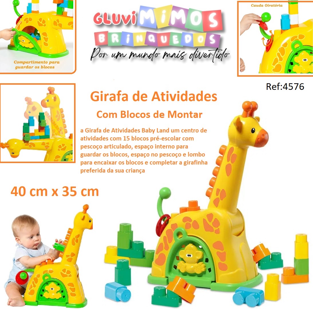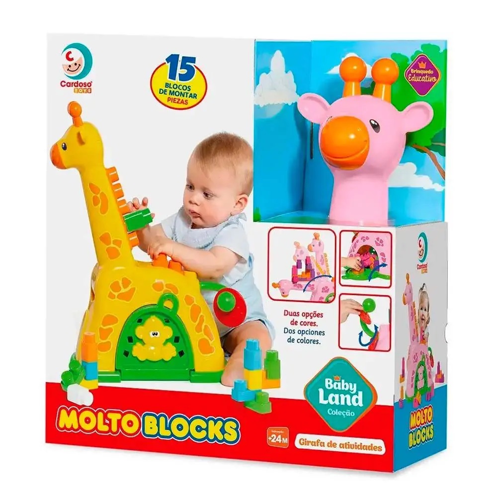 Blocos de Montar – Baby Land – Girafa de Atividades – Amerela – Cardoso Toys: a Girafa de Atividades Baby Land um centro de atividades com 15 blocos pré-escolar com pescoço articulado, espaço interno para guardar os blocos, espaço no pescoço e lombo para encaixar os blocos e completar a girafinha preferida da sua criança!