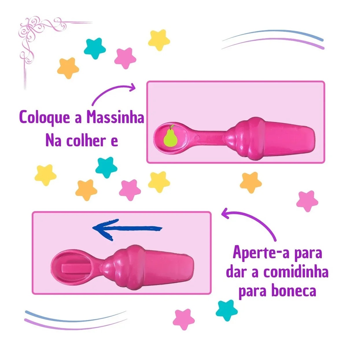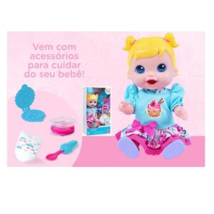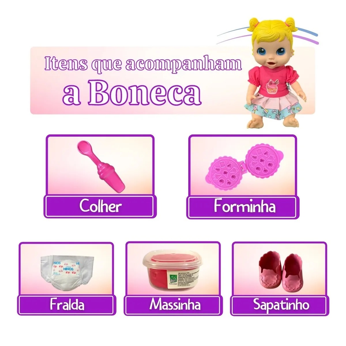 A brincadeira fica mais divertida com os acessórios que acompanham: colher, forminha de comida, massinha (01 potinho com 35g) e uma fraldinha (acessórios lúdicos), para vocês brincarem muito na hora de comer!