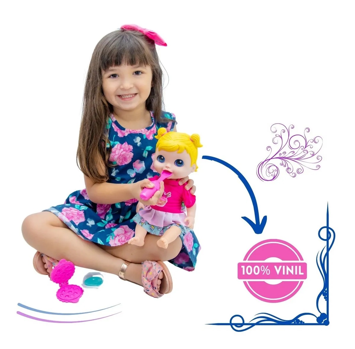 Tamanho aproximado do boneco: 35cm de altura. Boneca inteiro em de vinil macio e perfumado, cabelo enraizado.