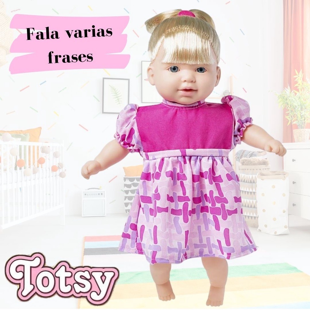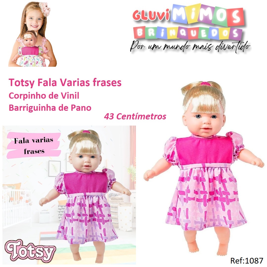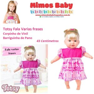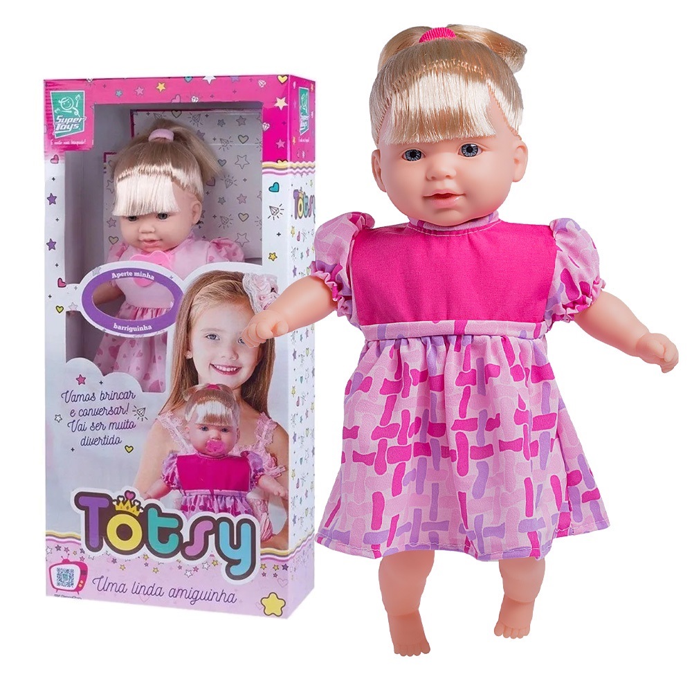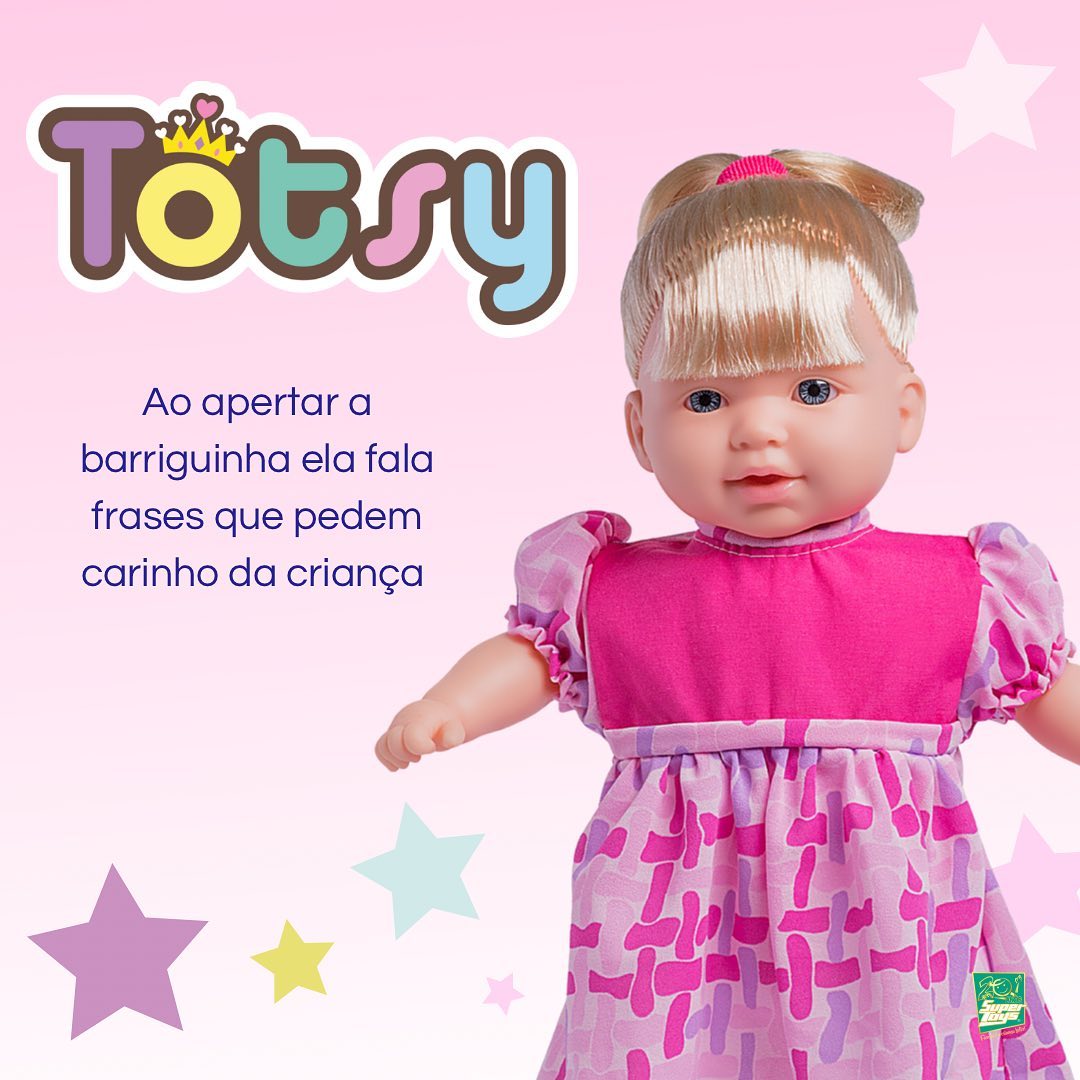 Boneca Totsy Frases com Cabelo – Super ToysA Boneca Totsy é uma boneca macia e perfumada que fala Varias frases diferentes. Ela vem com uma linda mamadeira para dar comida a Totsy, o que estimula o desenvolvimento lúdico da criança. A diversão vai ser garantida!