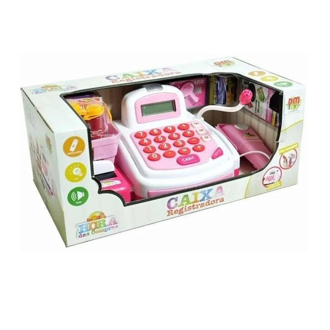 Ela é eletrônica, emite luzes e sons, vem com esteira, botões com números, som do leitor de código de barras, calculadora e gaveta para guardar o dinheiro recebido.