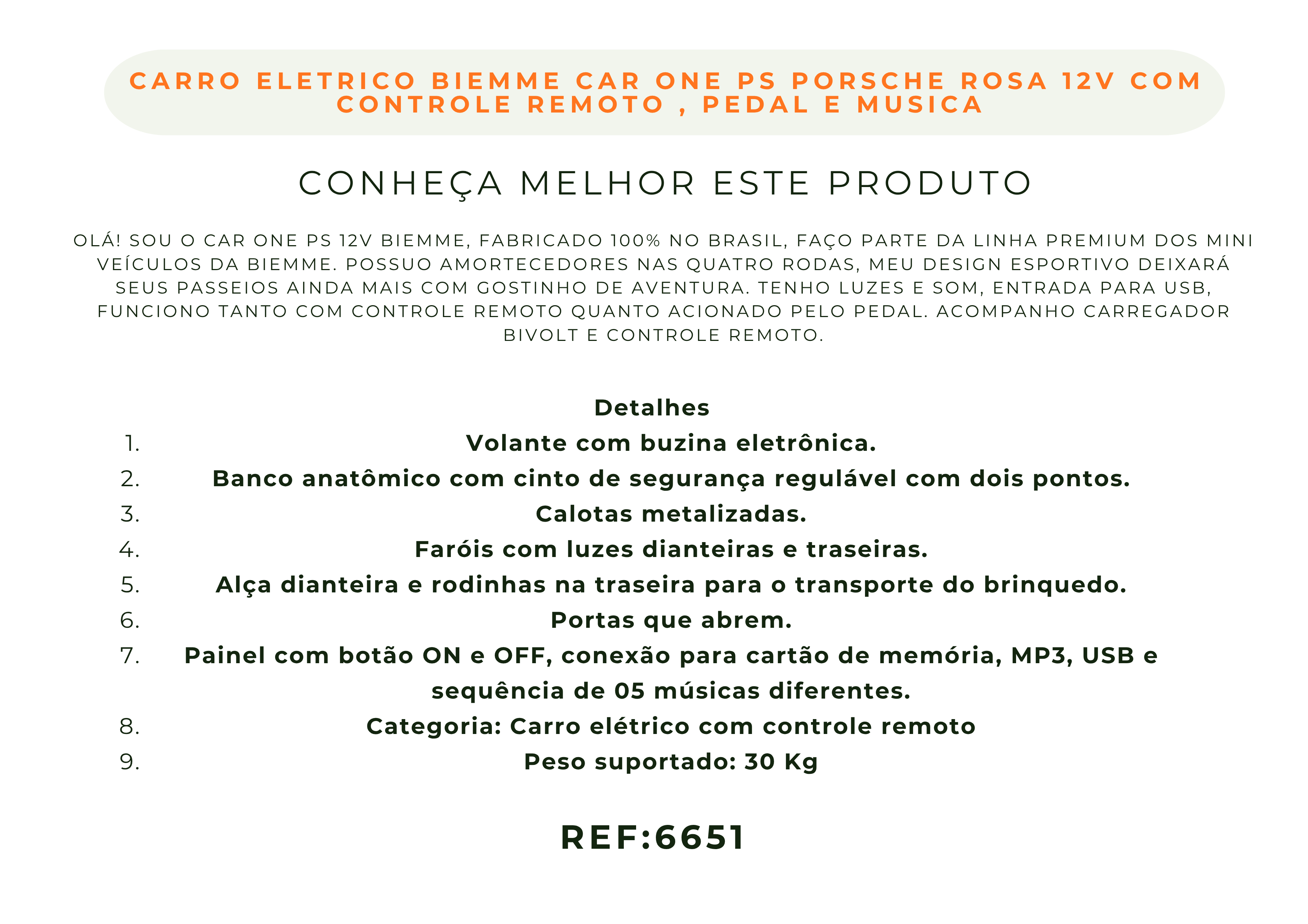 Olá! Sou o Car One PS 12V Biemme, fabricado 100% no Brasil, faço parte da linha premium dos mini veículos da Biemme. Possuo amortecedores nas quatro rodas, meu design esportivo deixará seus passeios ainda mais com gostinho de aventura. Tenho luzes e som, entrada para USB, funciono tanto com controle remoto quanto acionado pelo pedal. Acompanho carregador bivolt e controle remoto.