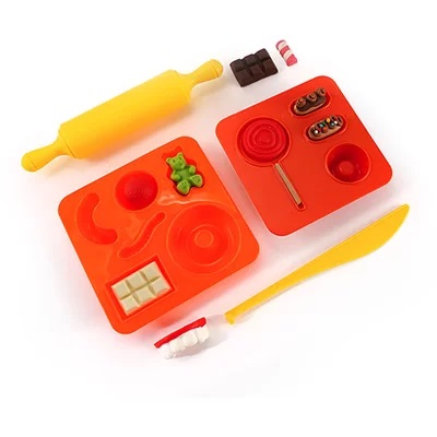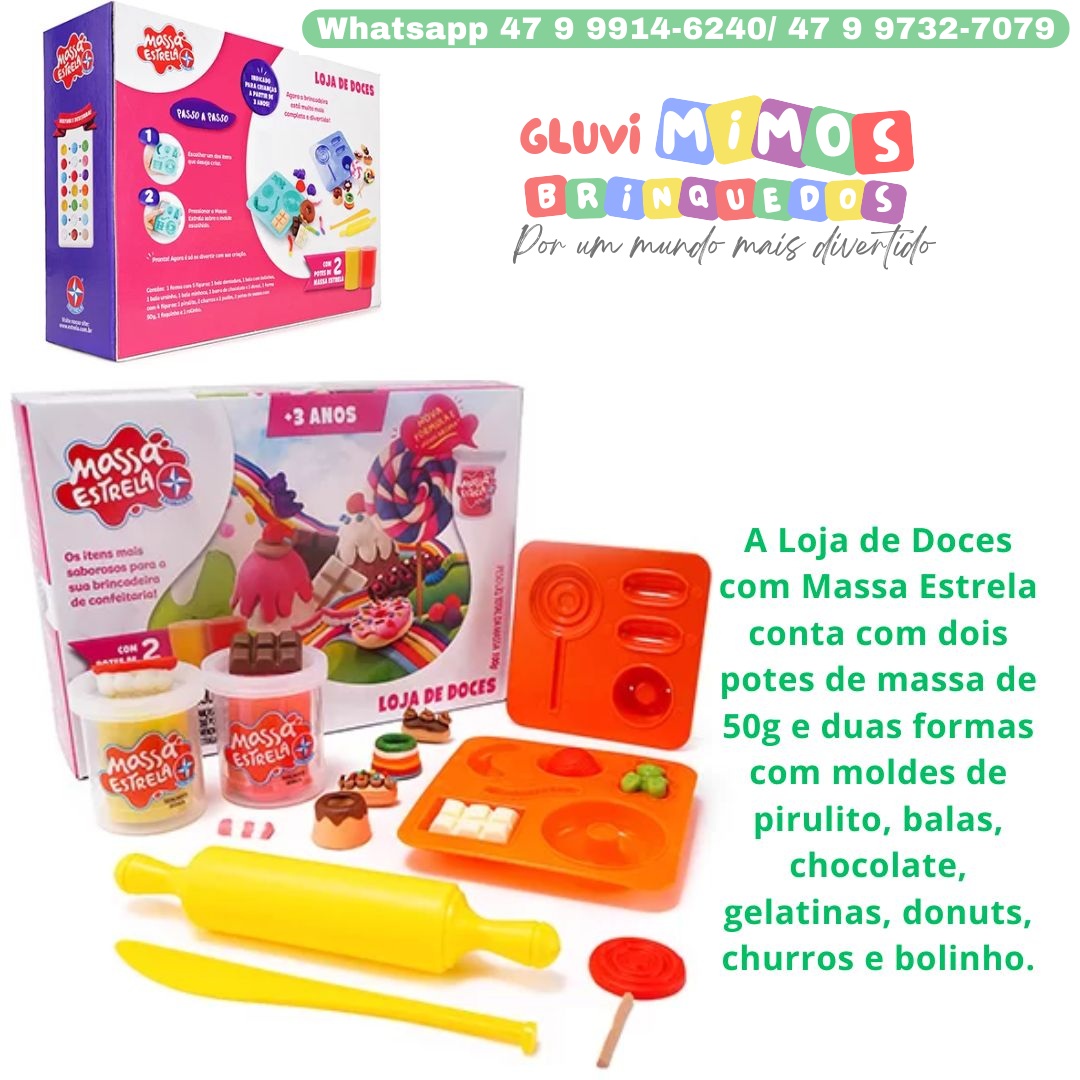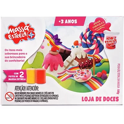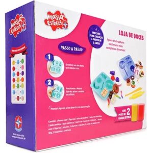 A Loja de Doces com Massa Estrela conta com dois potes de massa de 50g e duas formas com moldes de pirulito, balas, chocolate, gelatinas, donuts, churros e bolinho.
