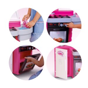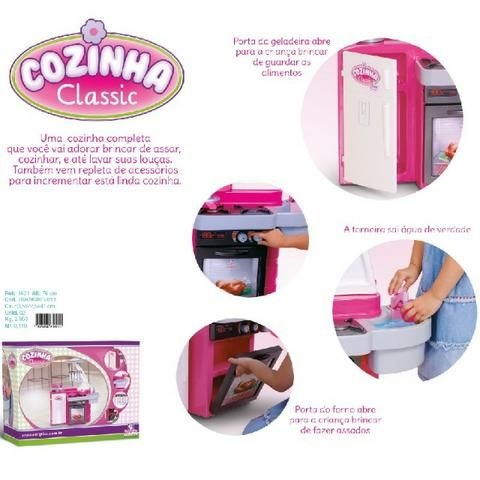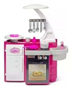 Ela vem com todos os produtos para tornar a sua cozinha em realidade. A geladeira abre e fecha, o forno abre e fecha, a pia sai água de verdade e os botes giram.