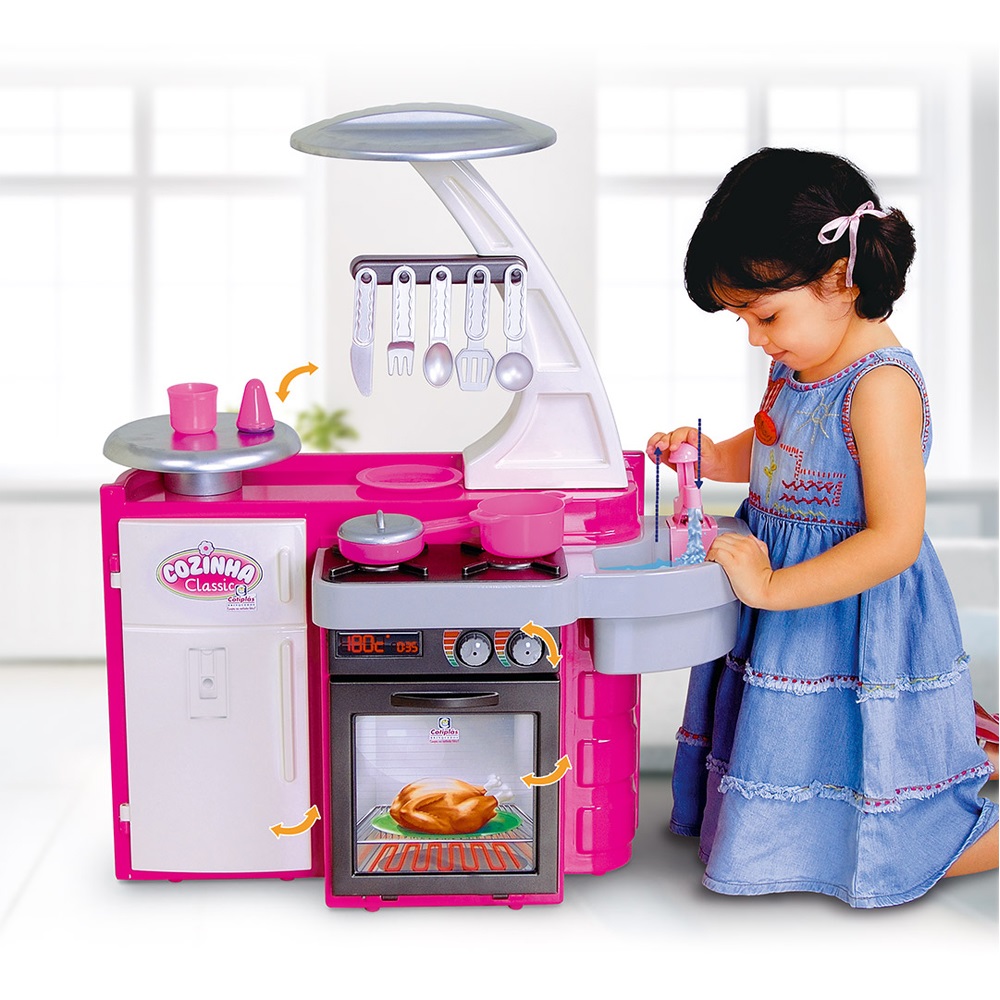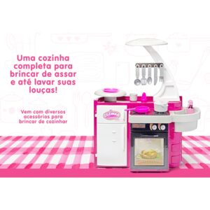 Sua menina pode fazer várias coisas na cozinha como: assar, cozinhar, lavar louças com água da pia que sai de verdade, guardar na geladeira as comidinhas, brincar de controlar a temperatura do fogãozinho e forninho através dos botões e muito mais!