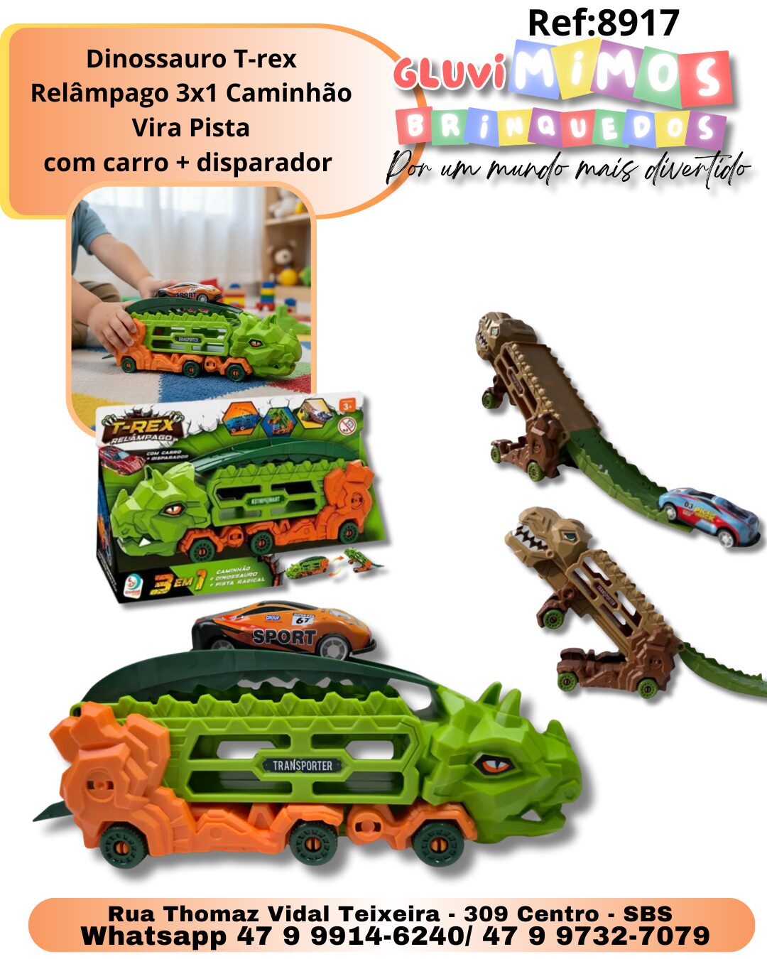 Dinossauro T-Rex Relâmpago 3 em 1 – Caminhão que Vira Pista + Carro com Disparador – Cardoso Toys