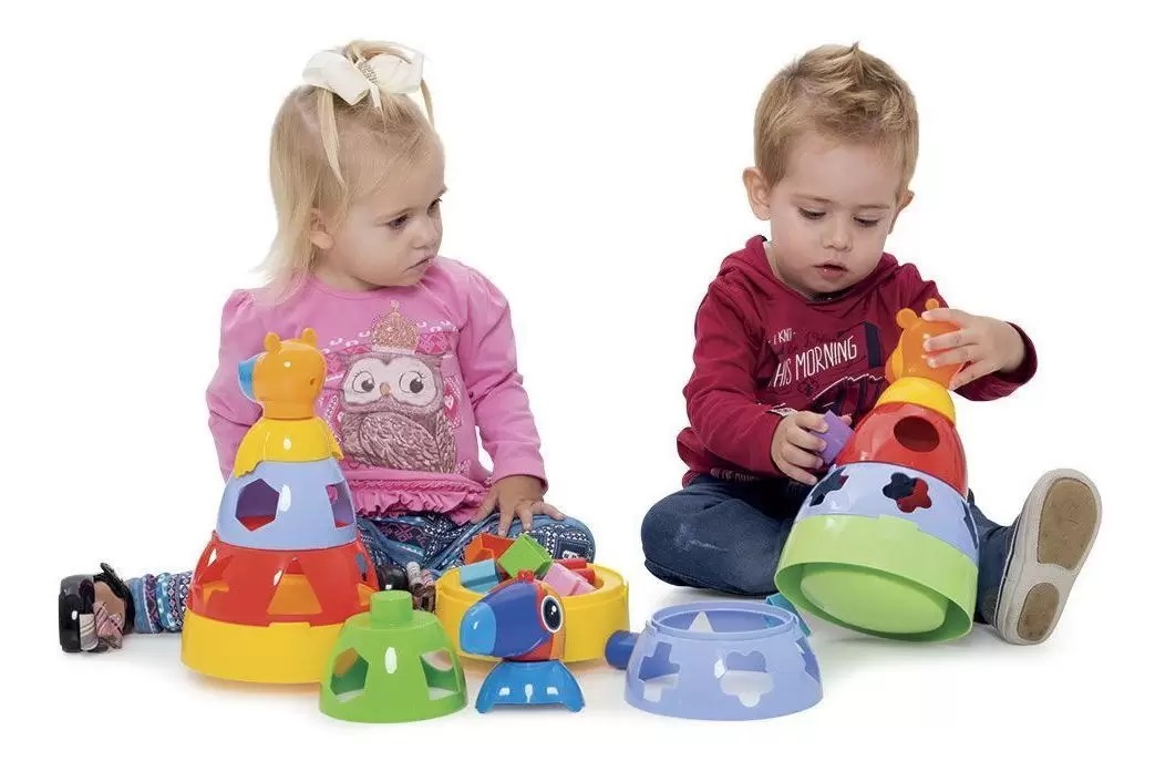 Acompanha 10 peças com formas geométricas para encaixar e aros para empilhar.