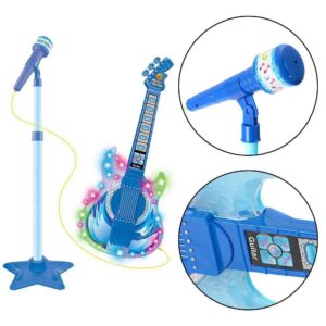 Guitarra com luzes coloridas e microfone, para brincar de cantar, tocar e se sentir como uma estrela! Conecte seu MP3 player ou smartphone para cantar com as suas músicas favoritas (MP3 player e/ou smartphone não incluídos)!
