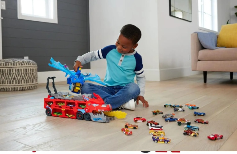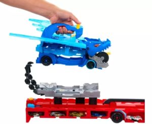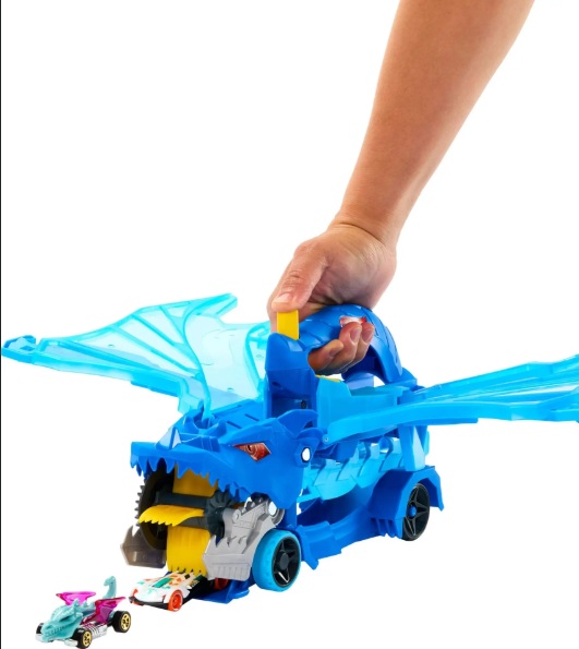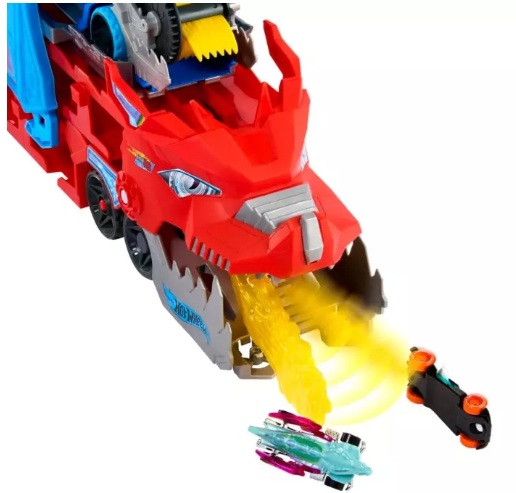 Você pode dirigir para a batalha com este caminhão Hot Wheels City Supertrailer de dragão em grande escala que apresenta um dragão adicional destacável que devora veículos de brinquedo! Depois de derrubar carros com o dragão cuspidor de fogo, você pode destravar o dragão menor e transformá-lo em uma pista de corrida! Você pode pressionar o botão para fazer com que suas asas se movam e imitem um dragão de verdade e, em seguida, mergulhar para fazê-lo comer carros. Você pode voltar para a base e liberar os veículos nos lançadores, onde eles poderão decolar em pistas lado a lado! O transportador inclui dois carros em escala 1:64, mas as crianças podem armazenar mais de 20 veículos dentro e sobre os dois dragões. (Carros adicionais vendidos separadamente.) Você pode lançar ou conectar a pista Hot Wheels na frente para brincar na pista. As cores e as decorações podem variar.