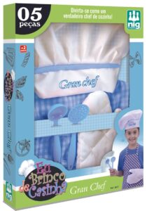 Os meninos que gostam de brincar de cozinheiro vão adorar este conjunto de mini “chef” com diversos acessórios como avental, chapéu de cozinheiro, luva e 02 talheres grandes de plástico para se transformar em um cozinheiro de verdade!
