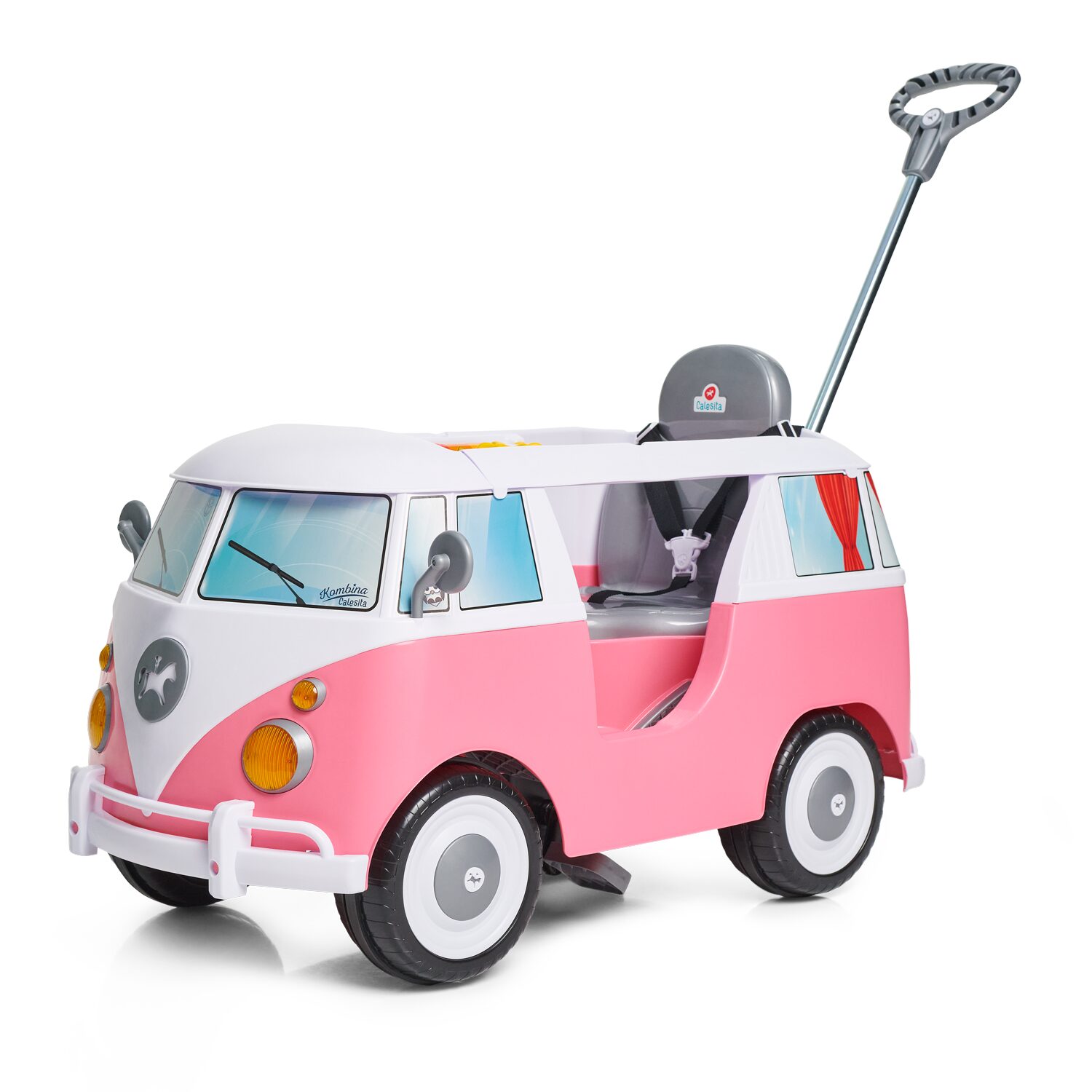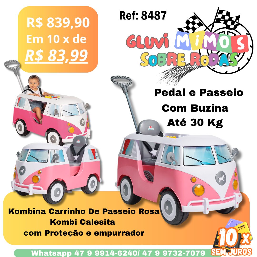 Kombina, um brinquedo dois em um. Passeio ou pedal! Super estilosa a Kombina encanta com as suas cores. Para a versão passeio, ela vem com acessórios como o apoio de pé, aro protetor e haste com suporte para bolsa.. Tem também um painel com peças em relevo, cores e formas que despertam a curiosidade dos pequenos e som que estimula a compreensão de causa e efeito. E para a diversão continuar com a versão pedal, é só desencaixar o aro protetor retirar o apoio de pé e a haste, pronto! Agora é só pedalar por aí! A Kombina é rica em detalhes, tem retrovisor e faróis de brincadeirinha, buzina, e até cinto de segurança. Tem também, um espaço para guardar pequenos acessórios ou garrafinha de água.
