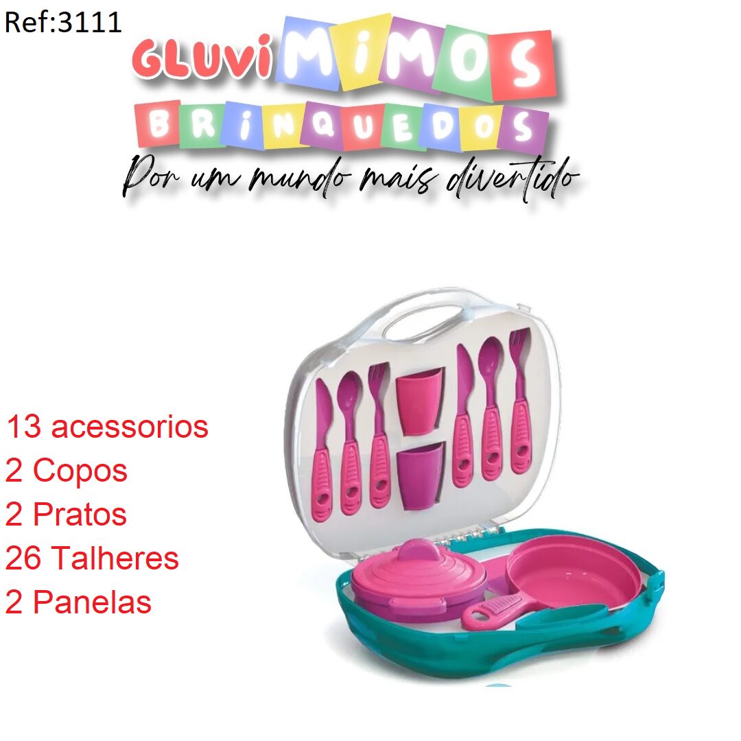 – Contém na embalagem: 1 Maleta, 1 Panela, 1 Tampa, 1 Frigideira, 2 Pratos, 2 Copos, 2 Garfos, 2 Facas, 2 Colheres.