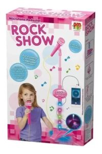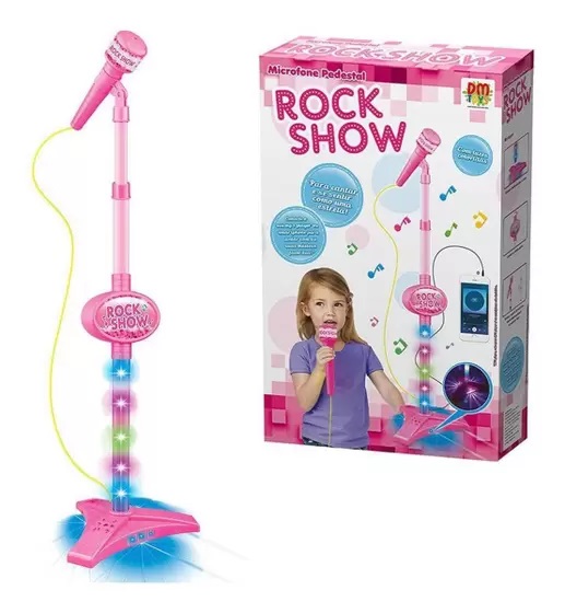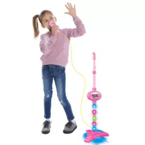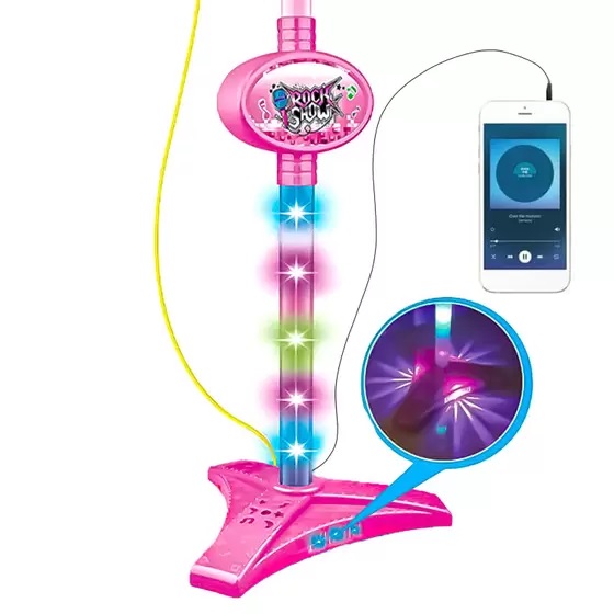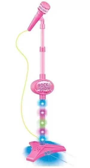 Microfone com pedestal e luzes coloridas. Para brincar de cantar e se sentir como uma estrela! Conecte seu MP3 player ou smartphone para cantar com as suas músicas favoritas (MP3 player e/ou smartphone não incluídos)!