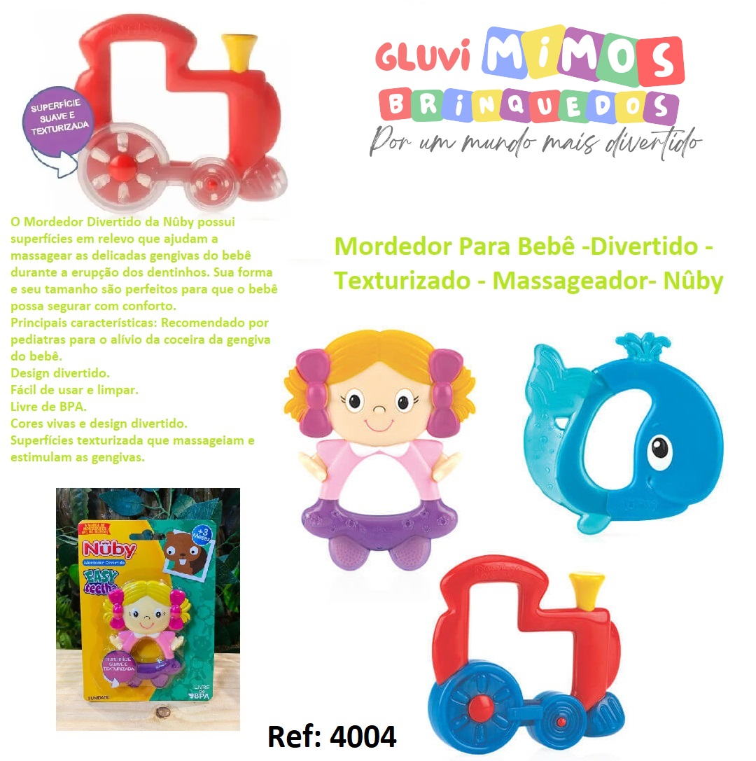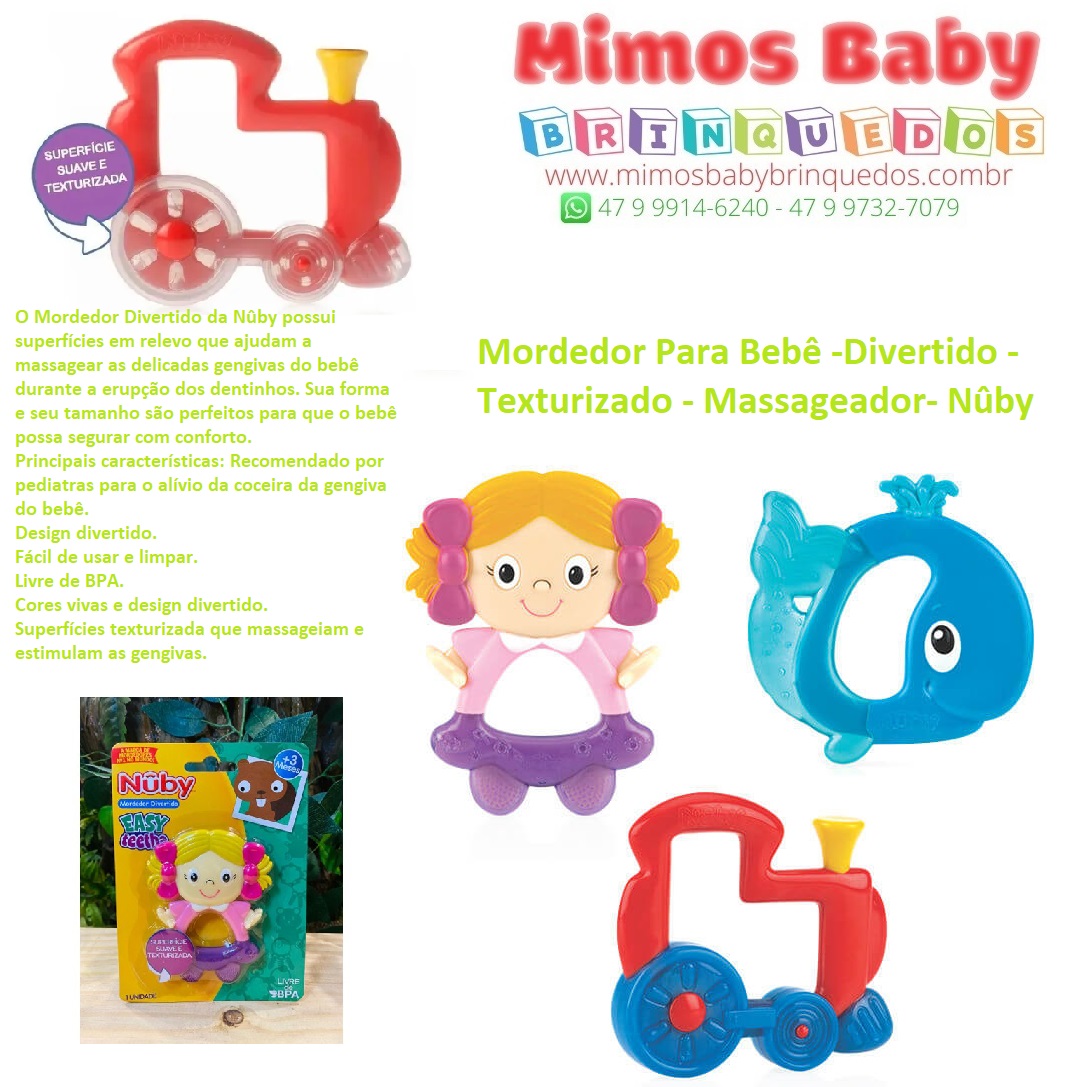 O Mordedor Divertido da Nûby possui superfícies em relevo que ajudam a massagear as delicadas gengivas do bebê durante a erupção dos dentinhos. Sua forma e seu tamanho são perfeitos para que o bebê possa segurar com conforto.
