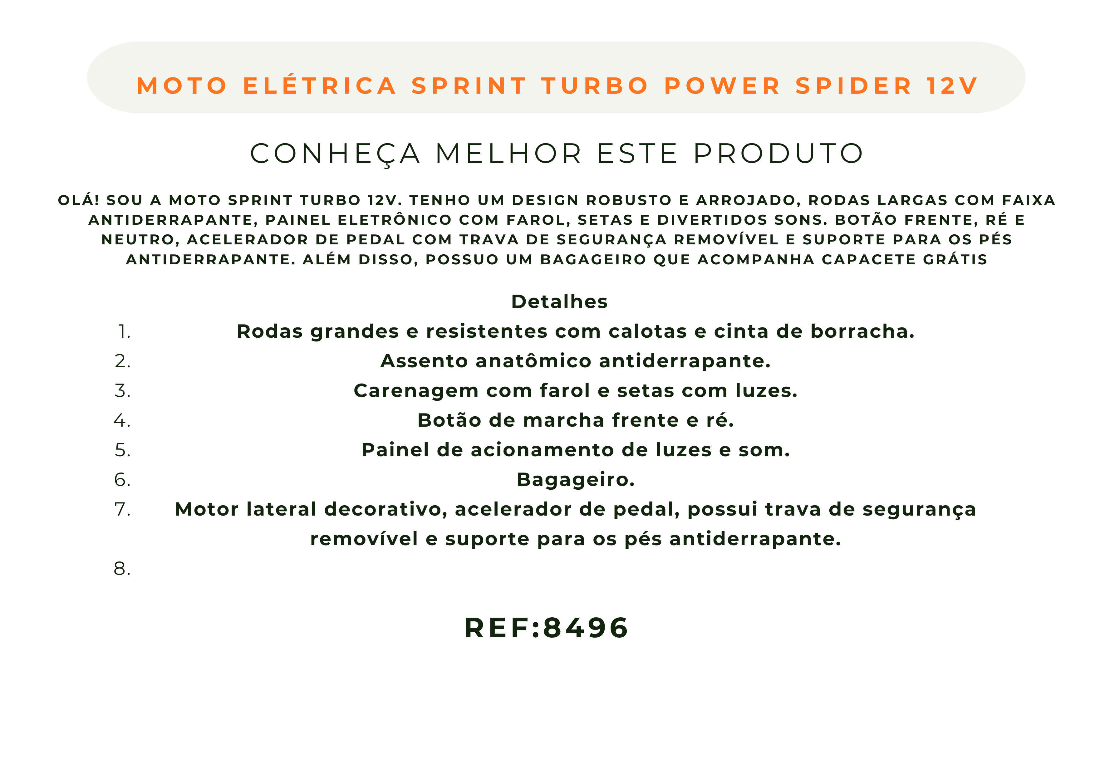 Olá! Sou a Moto Sprint Turbo 12V. Tenho um design robusto e arrojado, rodas largas com faixa antiderrapante, painel eletrônico com farol, setas e divertidos sons. Botão frente, ré e neutro, acelerador de pedal com trava de segurança removível e suporte para os pés antiderrapante. Além disso, possuo um bagageiro que acompanha capacete grátis.