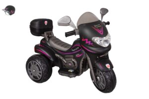 – Motores laterais cromados e decorativos, acelerador de pedal, possui trava de segurança removível e suporte para os pés com antiderrapante;