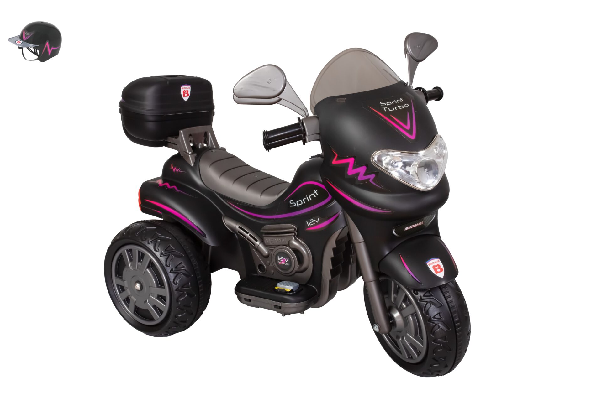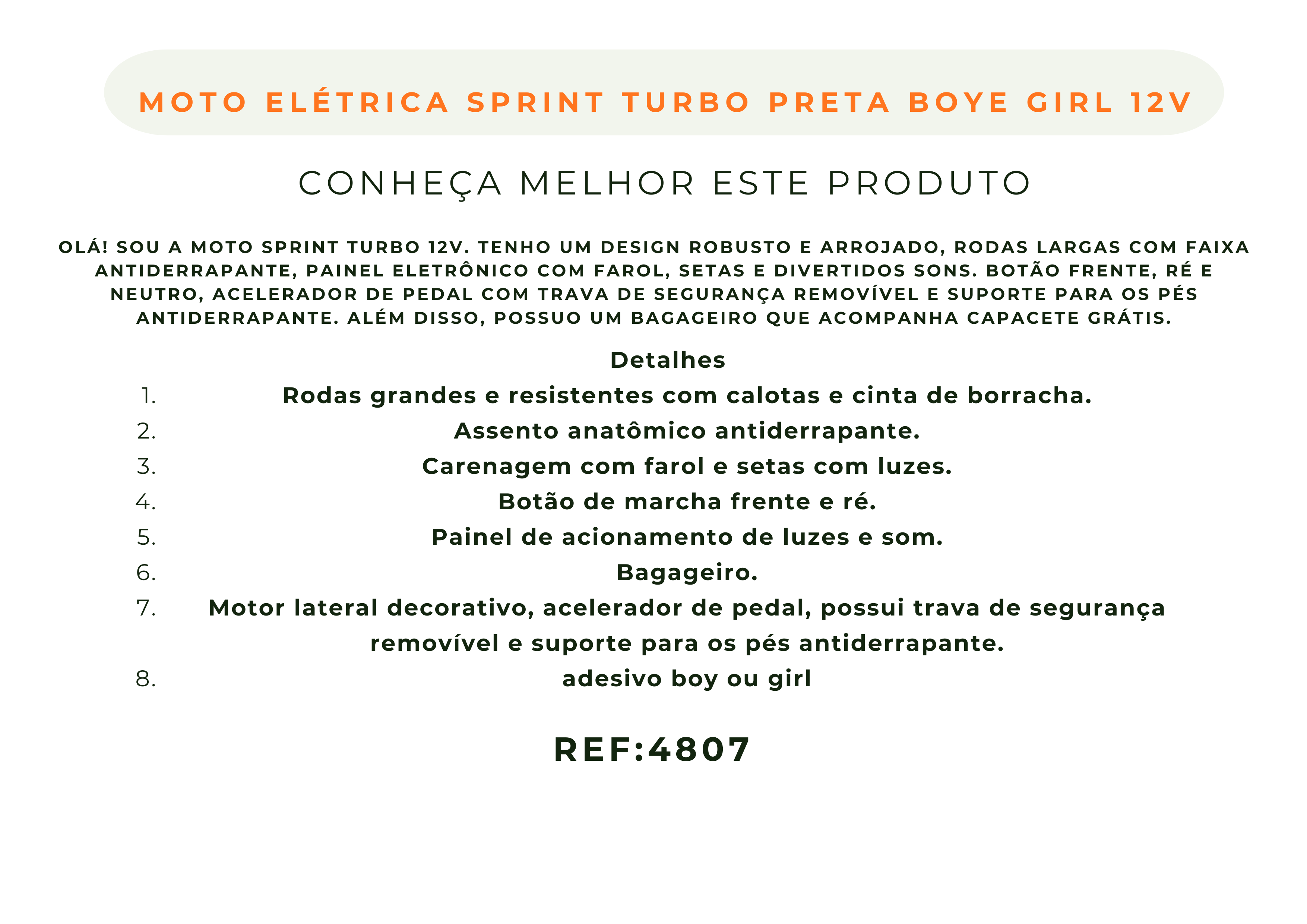 Olá! Sou a moto Sprint Turbo! Tenho um corpo grande, rodas largas, um painel com comando eletrônico que poderá acionar várias luzes e sons, um bagageiro para carregar seus brinquedos durante nossos passeios.