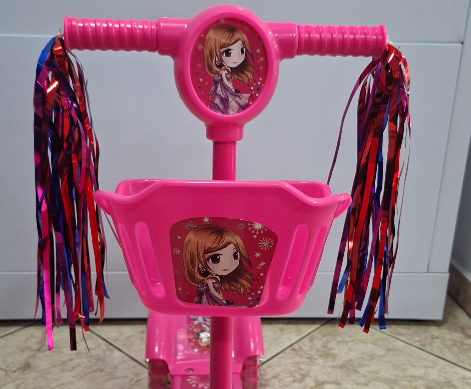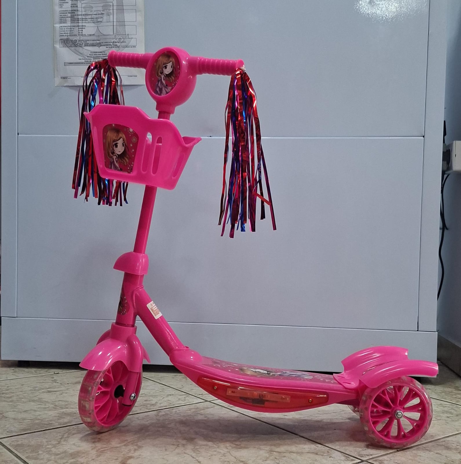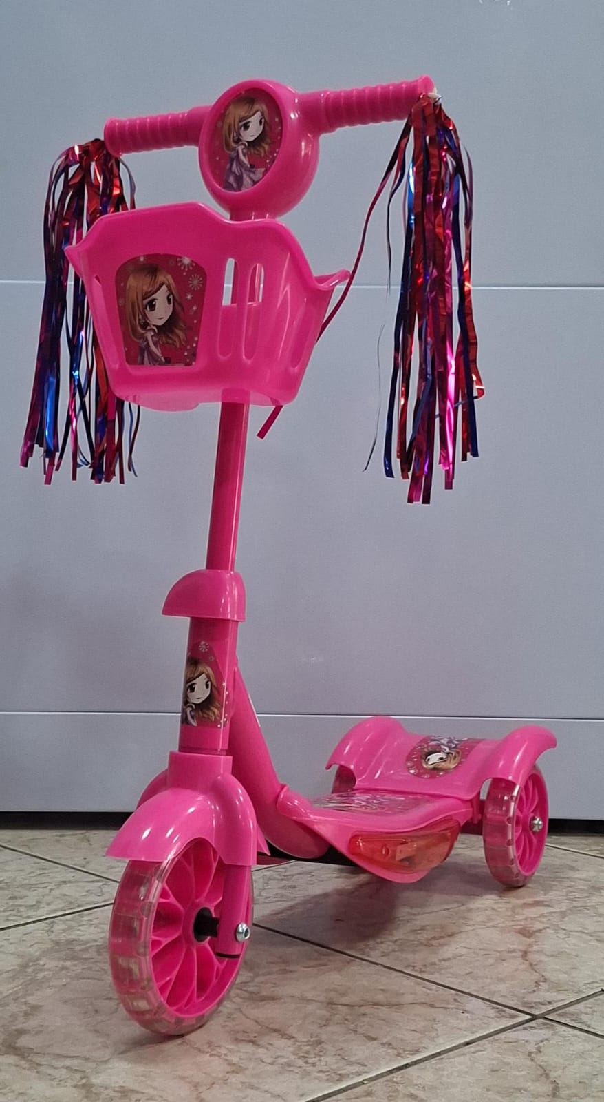 Patinete Rosa com Cestinha, Luzes e Musicas Regulavel até 75 cm de Altura – Suporta Até 35 KG