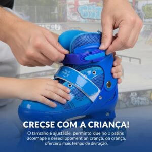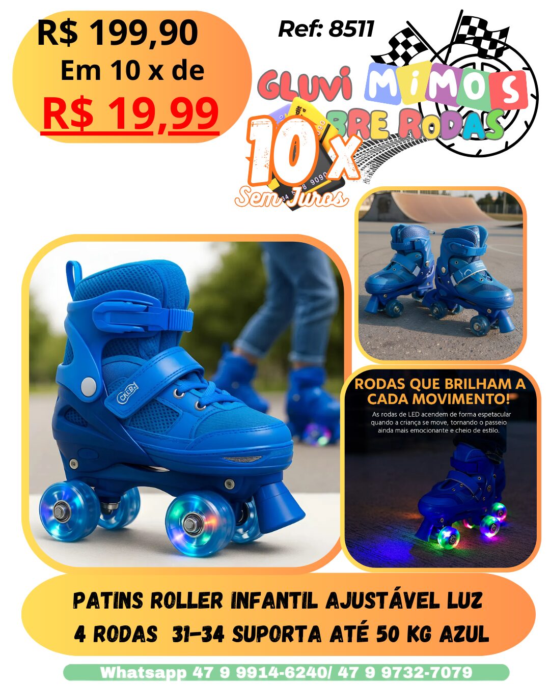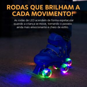Patins Roller Infantil Ajustável Luz 4 Rodas 31-34 Suporta até 50 kg Azul
