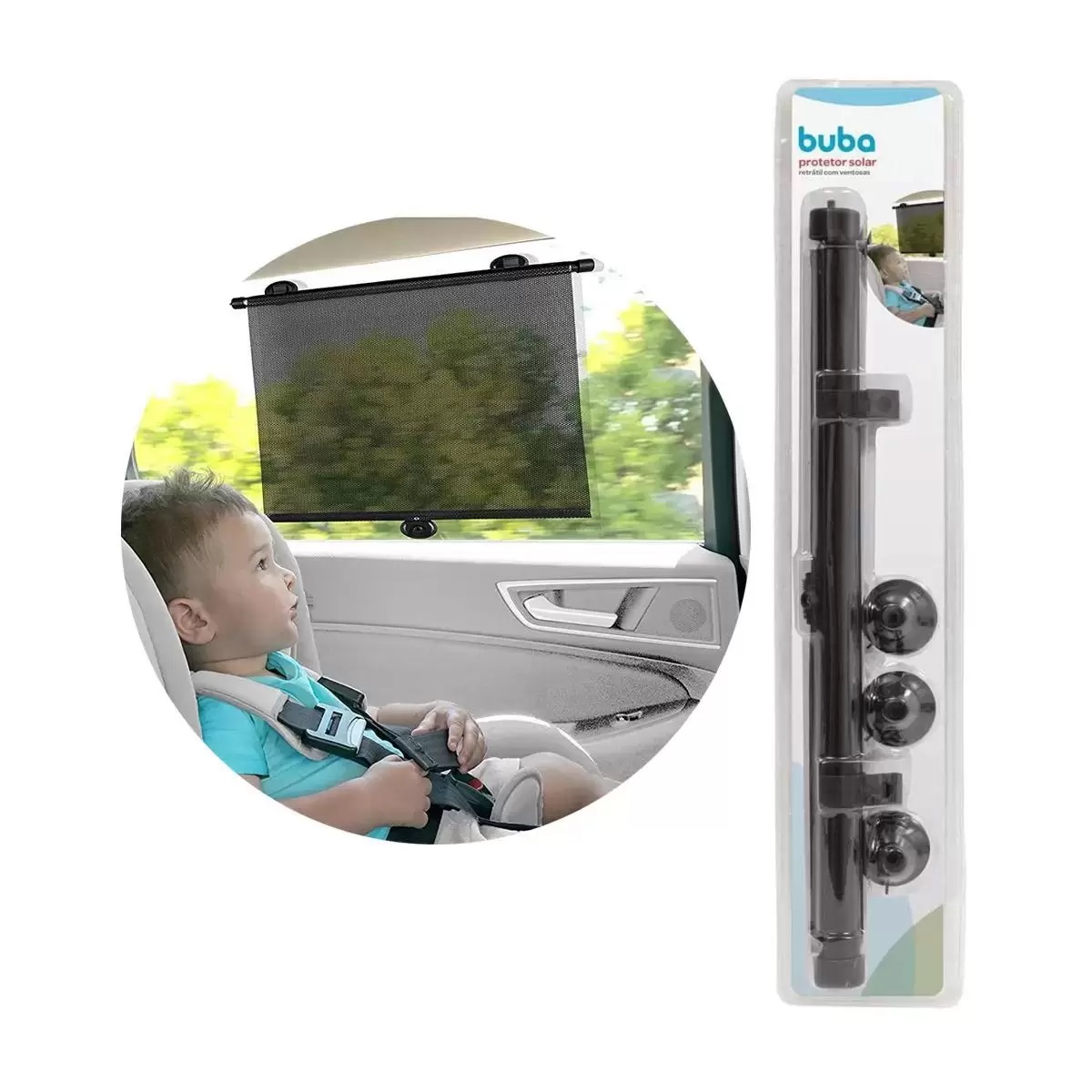 O Protetor Solar da Buba protege os pequenos da exposição à luz e aos raios solares durante os passeios de carro.