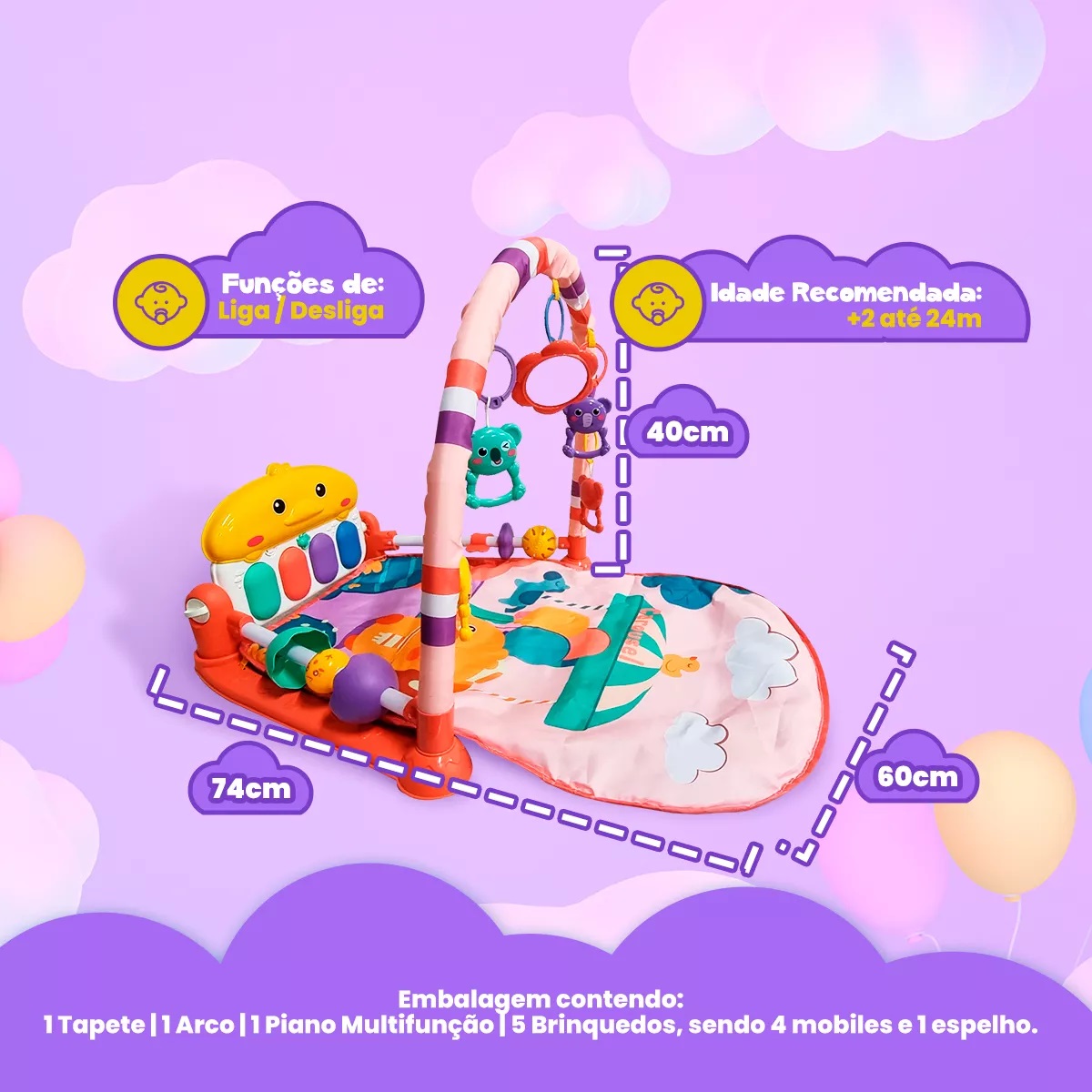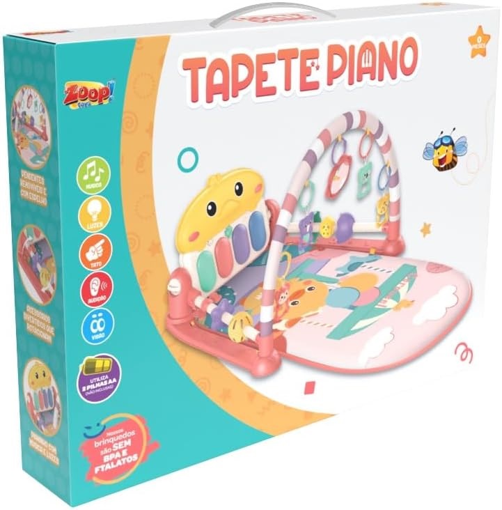 • Embalagem contendo: 1 Tapete, 1 Arco, 1 Piano Multifunção e 5 Brinquedos, sendo 4 mobiles e 1 espelho.