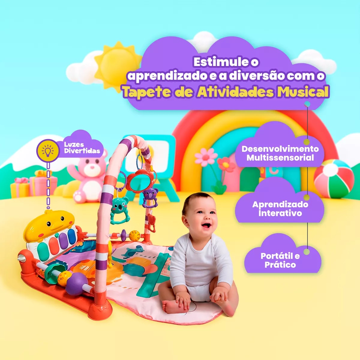 • Desenvolvimento Tátil: Os brinquedos pendurados e o piano na base promovem o desenvolvimento muscular dos braços e pernas do bebê;