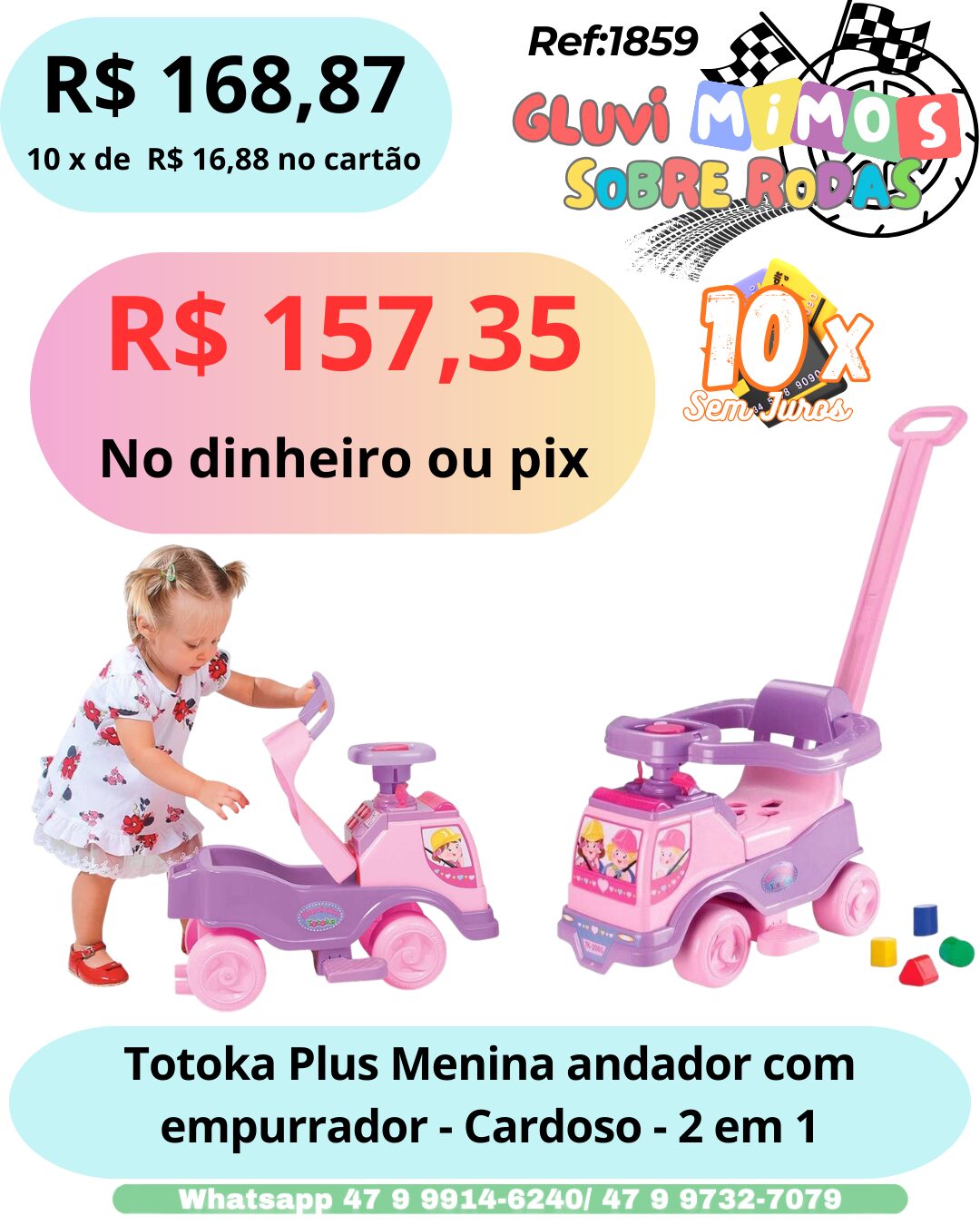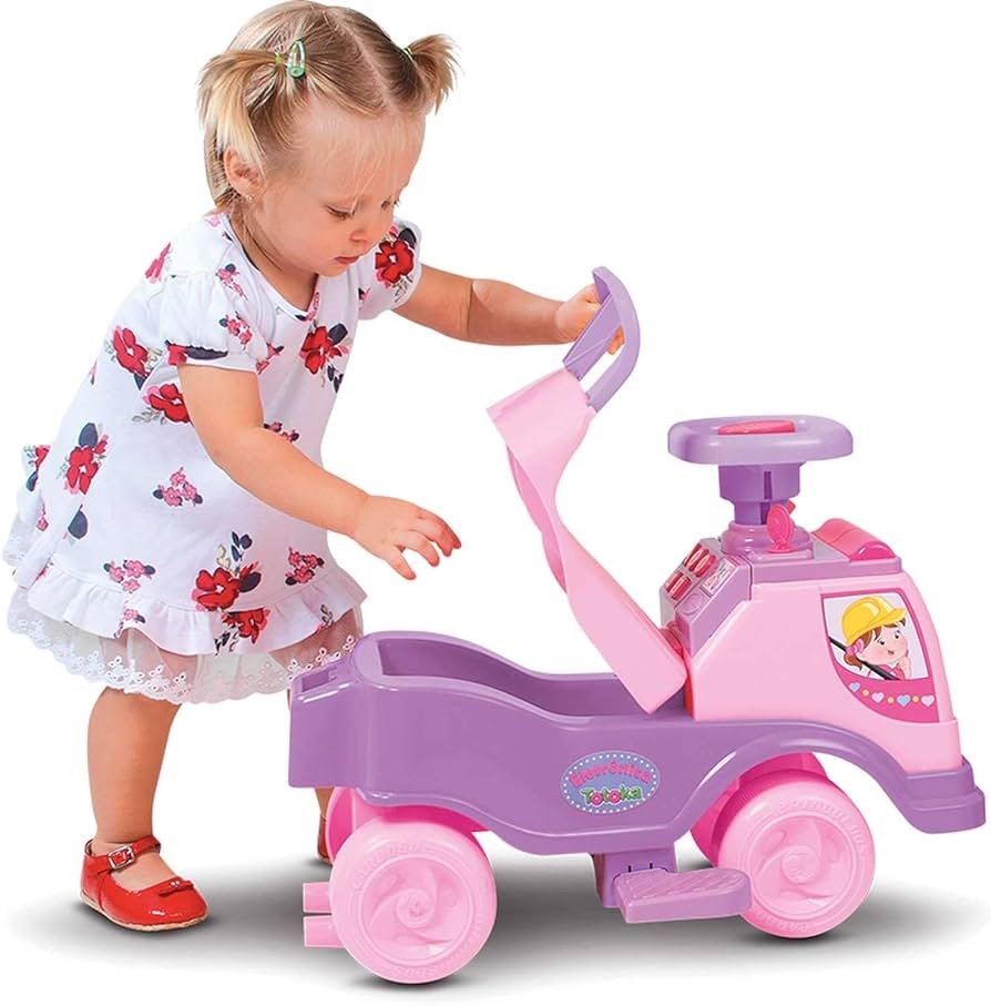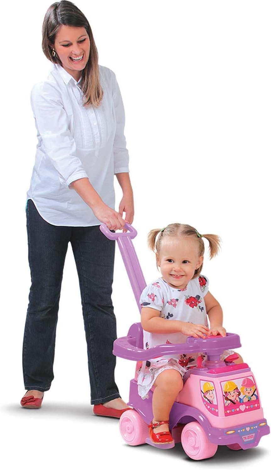 Reunindo segurança, conforto e praticidade em um só produto, ele agrega apoio para os braços junto ao aro de segurança, empurrador para os pais acompanharem as pequenas durante o percurso, luzes que piscam, além de emitir sons e agregar chave que liga e desliga.