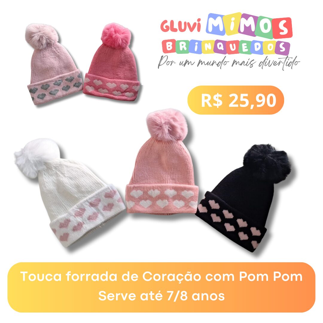 Touca forrada de Coração com Pom Pom Serve até 7/8 anos