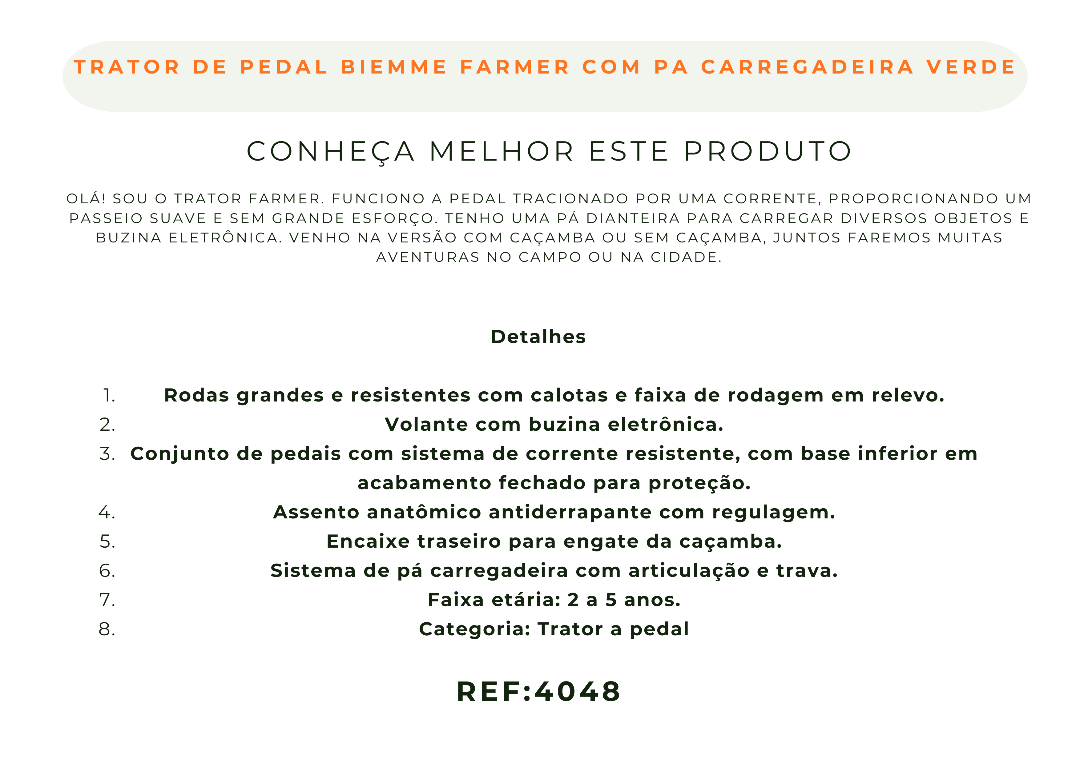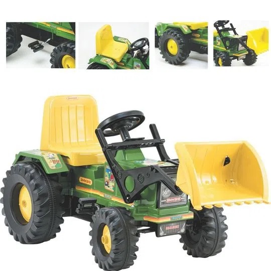 Olá! Sou o Trator Farmer. Funciono a pedal tracionado por uma corrente, proporcionando um passeio suave e sem grande esforço. Tenho uma pá dianteira para carregar diversos objetos e buzina eletrônica. Venho na versão com caçamba ou sem caçamba, juntos faremos muitas aventuras no campo ou na cidade.