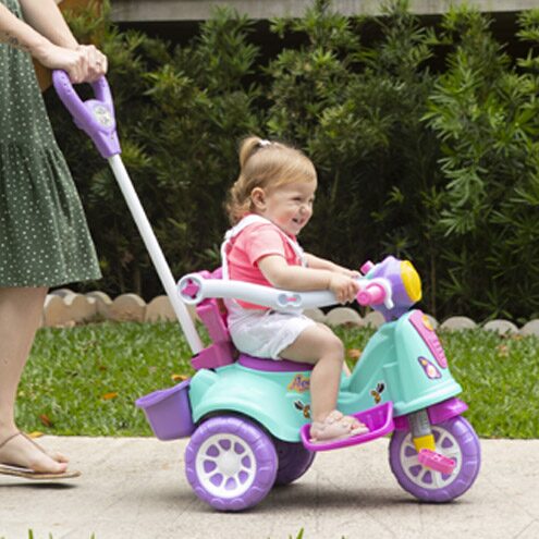 Um clássico da diversão, é o Triciclo Avespa – Pink! Ele é dois em um, na fase de passear ele possui anel de proteção com barra adicional de segurança e haste com suporte para bolsa e serve para o responsável guiar. Já na fase para pedalar, o pequeno já tem autonomia para se divertir com a buzina e se deslocar por conta própria com segurança.