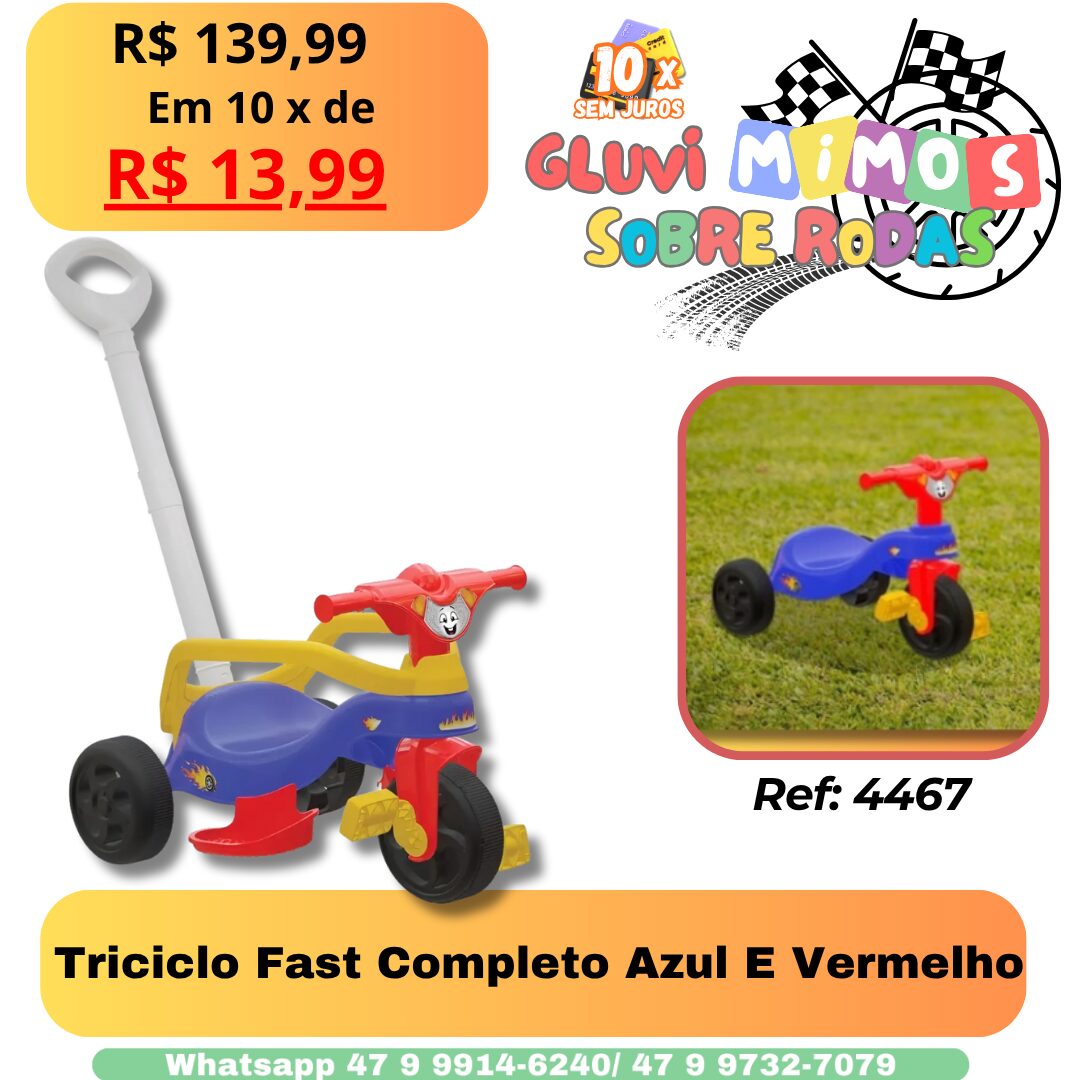 Triciclo Fast Completo Azul E VermelhoR$139,99 Clique aqui para efetuar sua compra ou tirar duvidas Palavra Chave : Carro Carrinho de Passeio Formas de Pagamento Escolha uma opção10x CréditoDinheiro / TransferênciaLimpar SKU: 4467 Categoria: Bicicletas / triciclos / Motoquinhas Descrição Informação adicional Avaliações (0) Descrição Informação adicional Formas de Pagamento 10x Crédito, Dinheiro / Transferência Avaliações Não há avaliações ainda. Seja o primeiro a avaliar “Triciclo Fast Completo Azul E Vermelho” Cancelar respostaO seu endereço de e-mail não será publicado. Campos obrigatórios são marcados com *Sua avaliação * Avaliar… Perfeito Bom Razoável Nada mal Muito ruim Sua avaliação sobre o produto *Nome * E-mail * Salvar meus dados neste navegador para a próxima vez que eu comentar. Produtos relacionados Bicicleta Infantil Aro 16 Nathor Tech Boys R$619,90 Este produto tem várias variantes. As opções podem ser escolhidas na página do produto Kit de Proteção Infantil com Capacete Joelheira Cotoveleira Preta R$69,90 Este produto tem várias variantes. As opções podem ser escolhidas na página do produto Carrinho de Passeio Triciclo Peixinho Com Cestinha Xalingo R$134,90 Este produto tem várias variantes. As opções podem ser escolhidas na página do produto Triciclo Pink Pantera 1 A 4 Anos Xalingo R$97,90 Este produto tem várias variantes. As opções podem ser escolhidas na página do produto