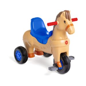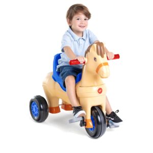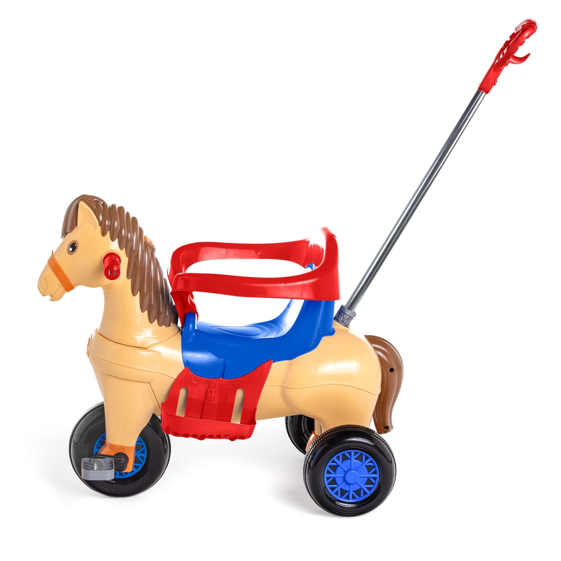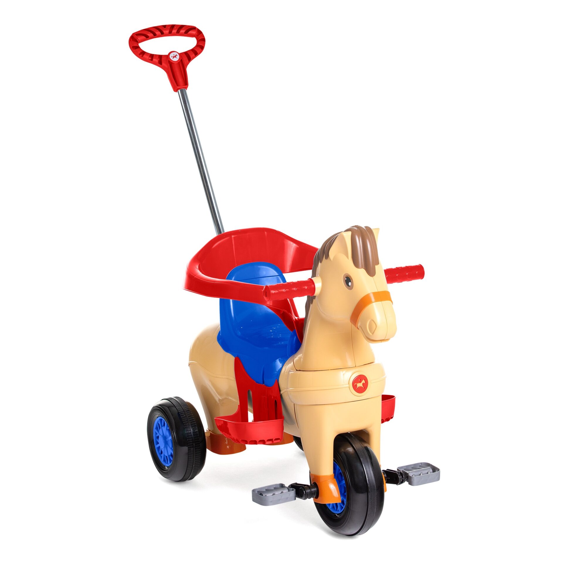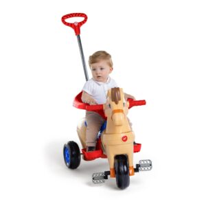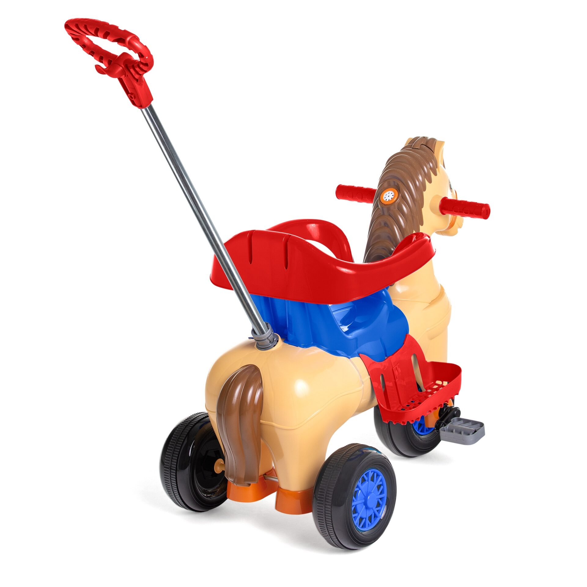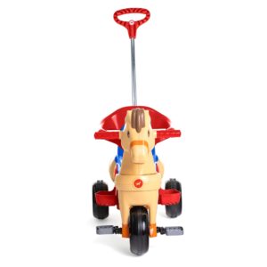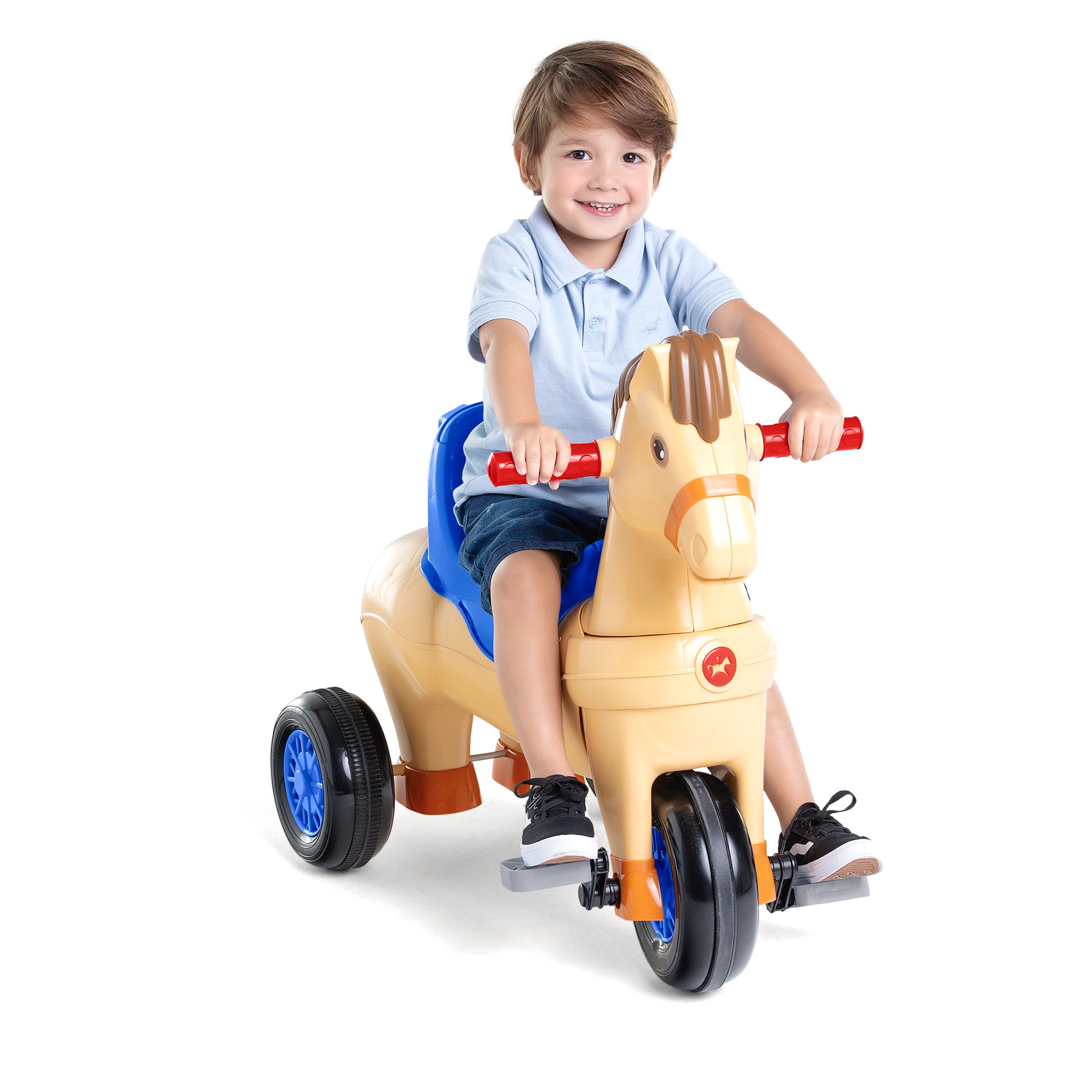 O cavalinho é um brinquedo 2 em 1, e acompanha as fases de crescimento da criança com conforto e segurança. Na primeira fase, o apoio de pés